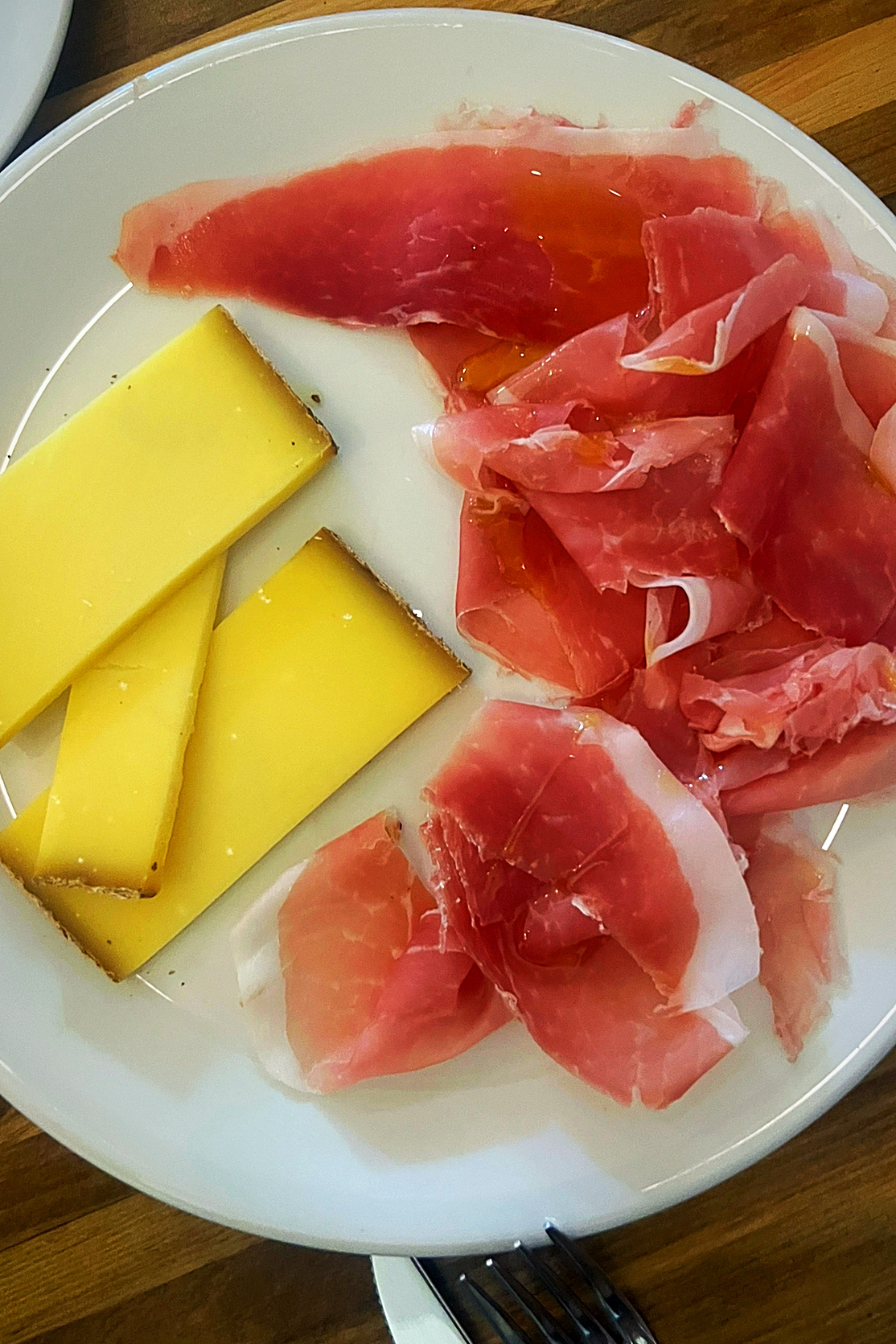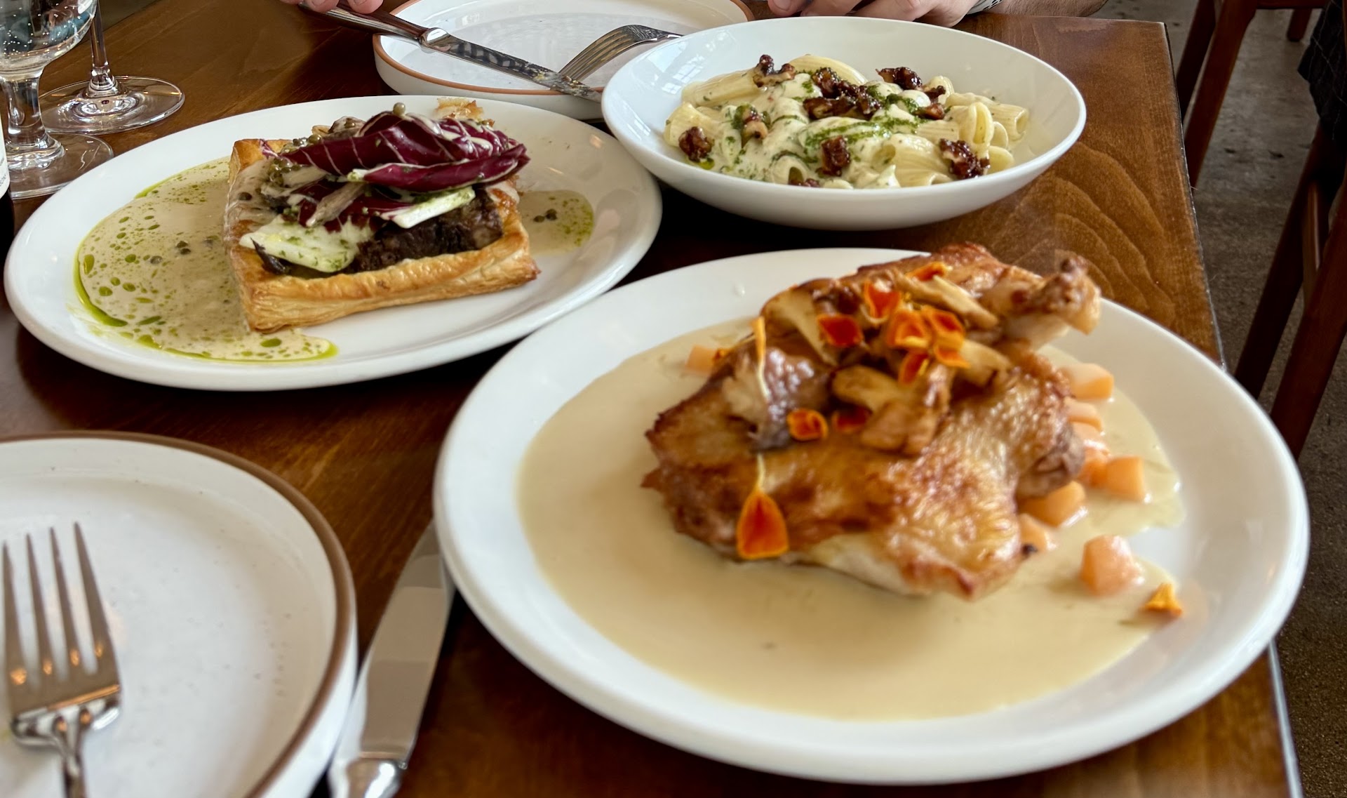 We started with the finocchiona (a must-have every visit) followed by the farinata ripiena—a perfectly-crisped chickpea flour crepe filled with cherry, fennel, and boursin. Next, we had the squash, which was presented beautifully and had amazing flavor. That was followed by their “peach with country ham” dish which consisted of generous slices of delicious peaches coupled with prosciutto-esque slices of aged ham and various accoutrements. This was one of our favorite dishes of the night: the flavors and textures were layered and complemented each other perfectly. Then we split 3 main courses: the rigatoni with taleggio, arugula, tarragon, and walnut (delicious); the poulet rouge (chicken) ‘under a brick’ with chanterelle mushrooms and apricot (perfectly crisped and moist chicken, full of flavor); and the wagyu beef en croute. We finished up with a scoop each of fresh ginger ice cream and brown butter salted caramel ice cream.