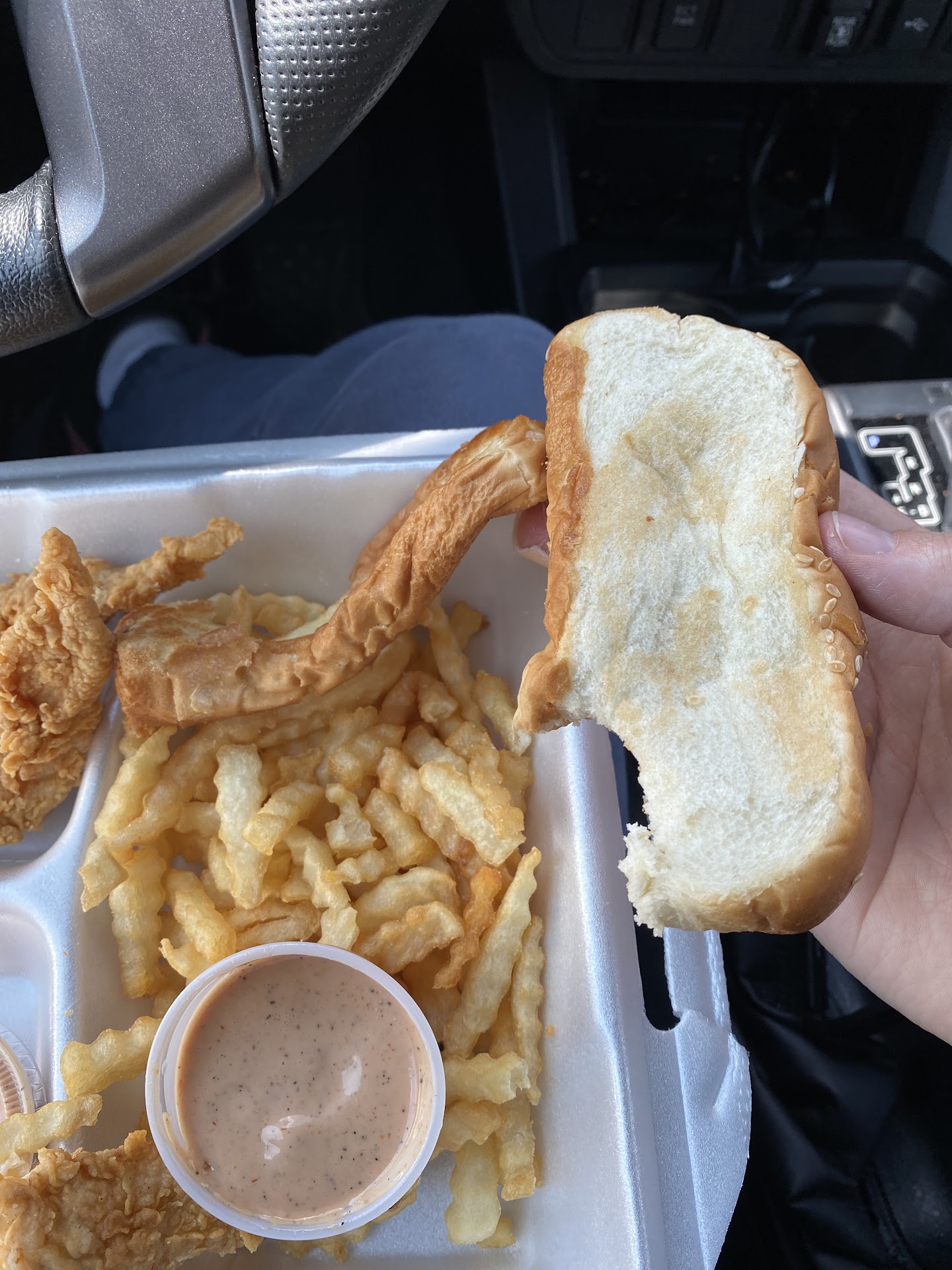 Very tasty toast, nicely chewy and toasted just enough. The fries are okay but nothing special, and too soft (never crispy at all) for some people. The sauce is good in my opinion but come on, have SOME variety at least - not everyone likes it. Their "slim" competitor (like in Streetsboro) absolutely destroys Cane's in the sauce department, if not in most other aspects. But of course Raising Cane's simply doesn't believe in variety whatsoever, apparently; they're pretty good at what they do and they stick to that and nothing more, period, the end, full stop.
