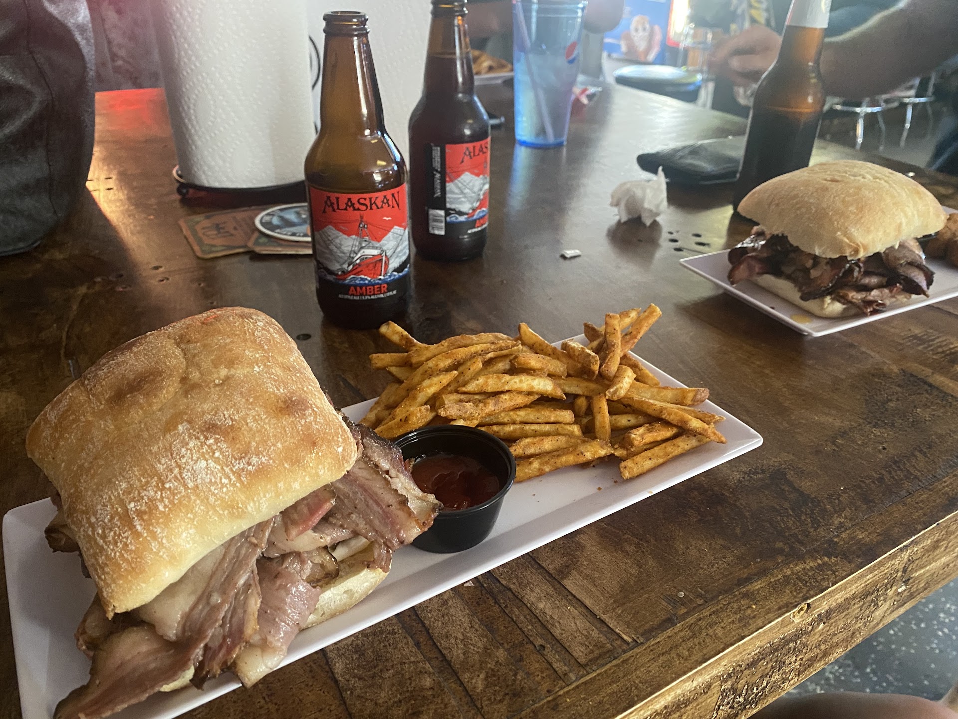 Ā Ā Ā Read moreSandwiches were huge, yummy and messy! Great smoked flavor brisket. Server was super friendly and even wanted to pay for our drinks for being patient. Of course we said no. The wait for those sandwiches was totally worth every second. We didnāt even notice a wait because we were drinking beer and playing darts. Fun place. They have awesome outside dining too. Pictured is the red brisket with the fries.