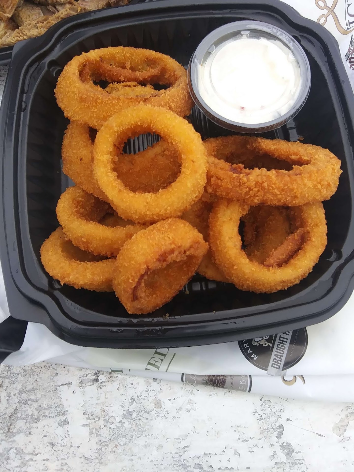 As could be reasonably expected from any takeout, the presentation isn't exactly wowing. Though a combination of draconian executive orders limiting restaurant capacity, the usual busy nature of Mackinac Island, and my own inability to plan ahead with a reservation makes this somewhat explainable. The rings are thrown together haphazardly in a black takeout container, a to-go cup of the dipping sauce balanced betwixt.
