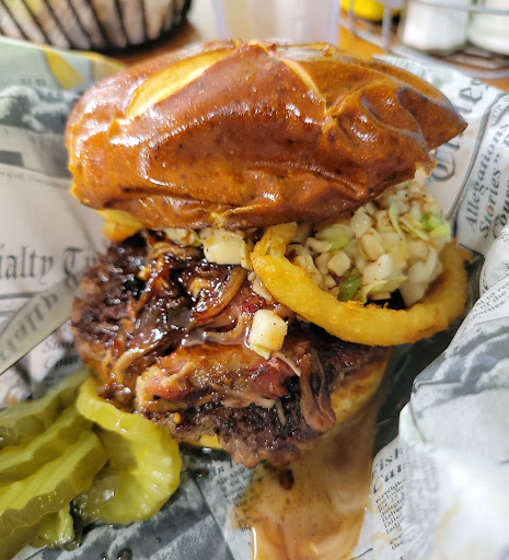 Read moreMy family came here for lunch on a Saturday afternoon knowing nothing about it, aside from the menu in the window. I had the PB&J Burger, which had peanut butter sauce, habanero jelly, and bacon it - I wasn't expecting the bacon, but I may have misread the menu. The burgers come with chips, or they have other sides available at an additional charge. Overall, I was pretty happy with my meal - the peanut butter and jelly went well with the bacon and burger, the bacon was salty and crispy, and the burger was cooked ok (I usually prefer mine more medium, but I'd say this was probably closer to medium well, with just a little pink in the center). I liked the pretzel bun, and the chips were perfectly normal chips. It came with a few slices of dill pickle on the side, too.