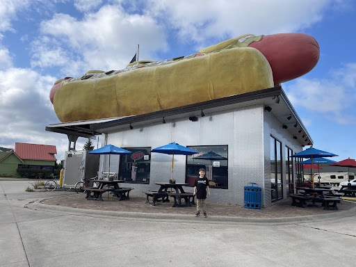 Read moreSince it was right before the holiday, it was one of the few affordable gigs in town. And it was raining outside, but I'm glad I went! I thoroughly enjoyed my bratwurst because it was perfectly made. It had that explosion when you first bite through the crispy exterior! Although I didn't order one, I overheard many customers ordering their milkshakes, so that will be a must try for next time. You can't miss the place it has a ginormous hot dog on the roof of the building and the inside has a bit of a 50s retro vibe due to the slick red vinyl booths and some bonus seating at the counter. A cute little place that I wouldn't mind visiting again. Only negative point to this experience had nothing to do with the restaurant itself but the parking arrangement. It's limited. And when some stinker parks inches away from your car so that your handicapped passenger can't get in, well that tends to alter my mood a little. The front and sides of the building are all glass windows so I'm sure our struggles in the rain we're observed by all...including the driver...but my brat was good! So...