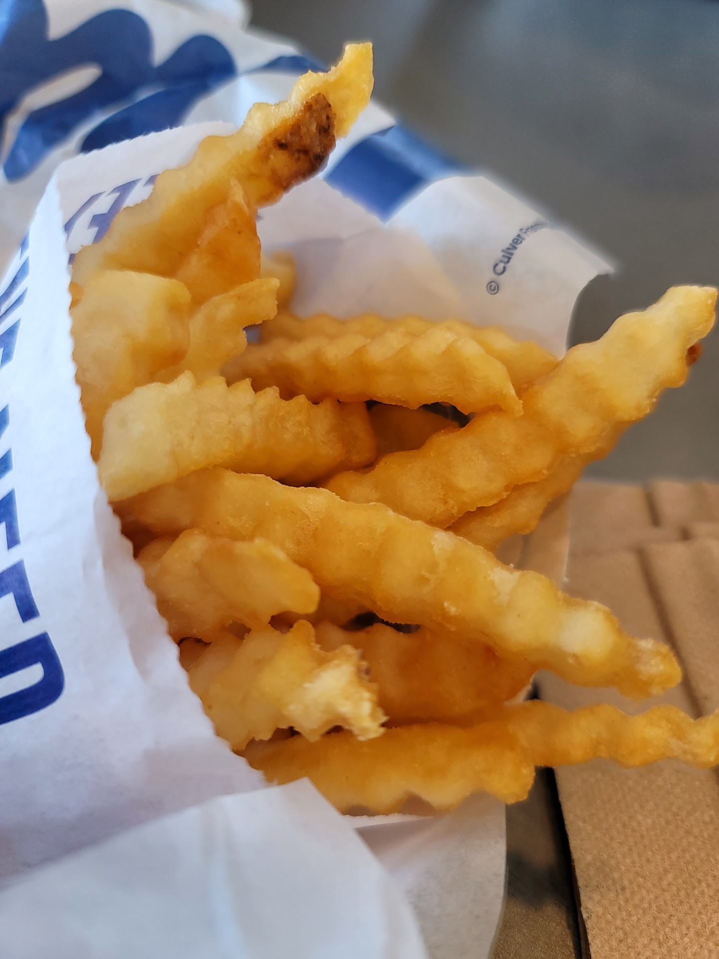 The food is why you go to eat anywhere, so let's start there. Culver's for me is all about the burger. The custard is another draw but the burger is the reason I'm there. I don't want ground beef even slightly undercooked, so I get the need to cook the patties thoroughly, but at this location, they are regular burnt in the edges (at the least) and the patties are cooked down to where they are much thinner than they should be. Only two times have I had a burger here that wasn't overcooked and burnt at least on the edges. That was when I ate inside, instead of going through drive-thru. Condiments need to be fresh - crispy and fresh-tasting, not warm, wilted, and/or soggy.