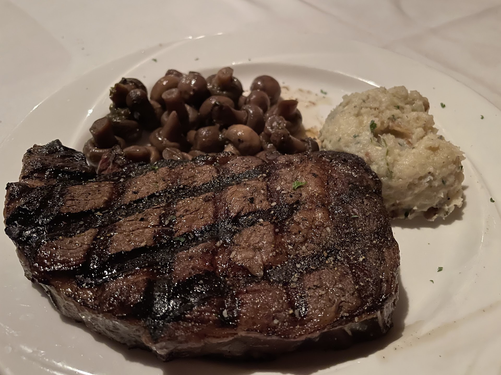 Read moreHere goes. Ok, the fare: My Husband's rib eye was cooked to order, med rare, but he described it as "fatty and grisly." He said his rib eye was well-seasoned and somewhat satisfying, but not remarkably so. My entree was a very simple grilled chicken with a scant, marsala-type dressing. It was SO over cooked that each bite, in spite of the sauce, was like endlessly chewing sawdust. I drank more than my usual share of water, trying my best to enjoy the fairly expensive, simple as could be, grilled chicken breast. How do you mess that up?? Def NOT a pub-like feel, more of a dark, uneven floored (very old/quaint) interior with a few wooden, shabby-chic, painted coat-of-arms hung about very dark walls. Candle lit tables, close in proximity to one another, with a hint of elevator style music in background. Translation: Others' conv easily overheard & you feel the need to very quietly speak with your date, so as not share your own conv with others. The order took far too long to arrive on a less-than-crowded evening. While our waitress was polite enough, my Husband had to find her, to inquire about our beverages. She seldom followed up. Nonetheless, we tipped well, thinking perhaps it was just an off night for our waitress. Envious though, of the tables in the very back, just behind us, that appeared to have more attentive waitstaff In summary? After 3-4 bites of my entree, I was so ready to leave. Just not a great atmosphere, vibe, and CERTAINLY not worth the cost. I.E. My super dry, overly-cooked chicken breast was $26.00. Had it been moist, flavorful, cost wouldn't remotely be an issue. Oh, the button mushrooms & grilled spinach were fine. Lol. Love what they're reaching for? But will not be dining...