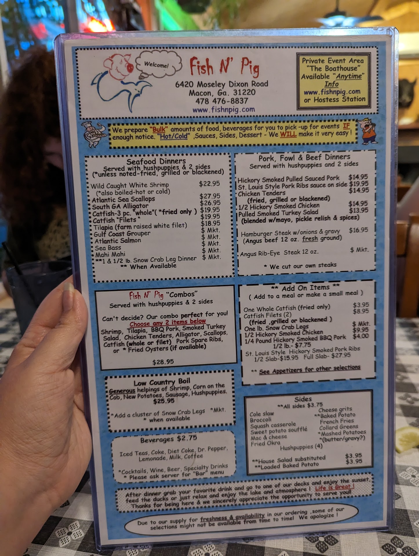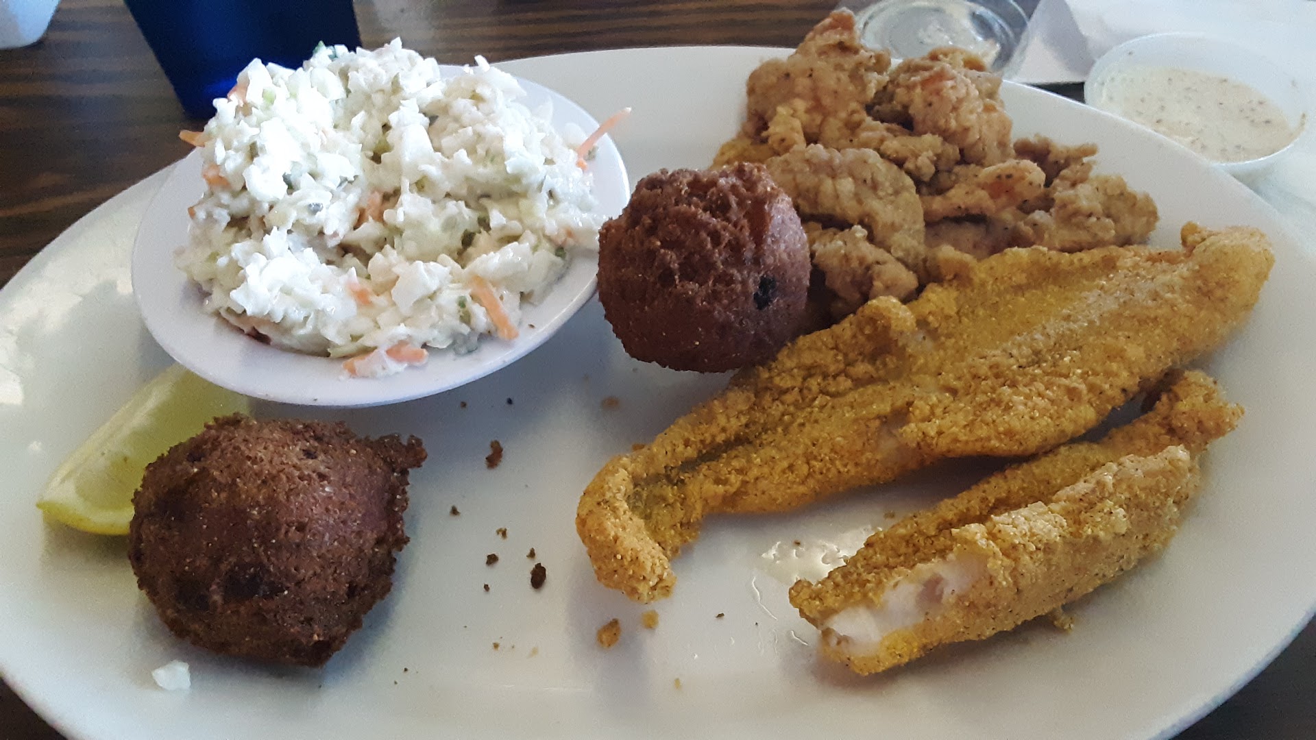 Read moreWe tried this place for the first time. It was good. We got the cheese sticks for an appetizer and being $10 I figured it would come with more than 5 cheese sticks. I got the catfish fillets with fries and okra they were both good. It came with 4 fillets and the fries were crinkle fries and the okra could have been cooked a little bit longer in my opinion. It also came with 2 hush puppies that were very good. My daughter got the catfish fillets also with mashed potatoes and gravy and mac n cheese and it was very good. My other daughter got the pulled pork sandwich and she loved it and my husband got the tilapia with shrimp combo with a loaded baked potato and squash casserole. Everything was delicious. It's decorated with lots of fun signs and there was a band playing. The waitress was very nice and did a decent job of keeping the drinks filled and bringing us anything we needed. All the food was hot and fresh. I would definitely eat here again. There's so many different...