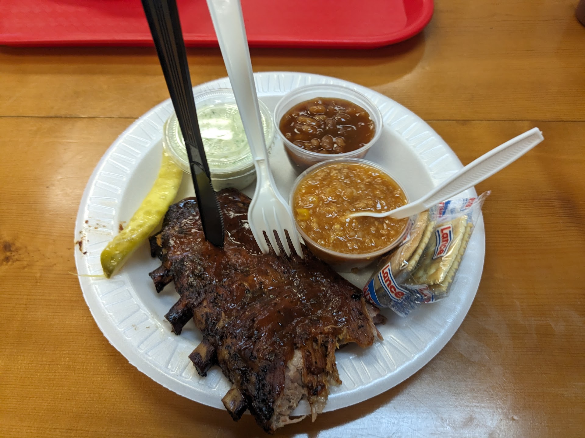 Food -- The menu is simple and that's a great thing. They have ribs, chopped barbecue, chopped chicken, Brunswick stew, coleslaw, and baked beans. And all of it is amazing! I got the rib plates which included everything on the menu: half a pound of ribs, Brunswick stew, coleslaw, baked beans, and two pieces of white bread. Some of the best barbecue I've had ever. The ribs were perfectly cooked, moist, and super tasty. The Brunswick stew is one of the only stews that I've had that reminds me of my childhood and parents fixing. The corn is mostly ground up which makes a big difference in a lot of Brunswick stew. It is by far one of the absolute best Brunswick stew I've ever had.