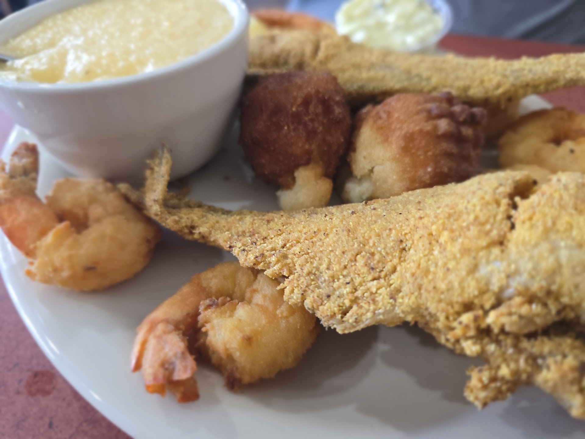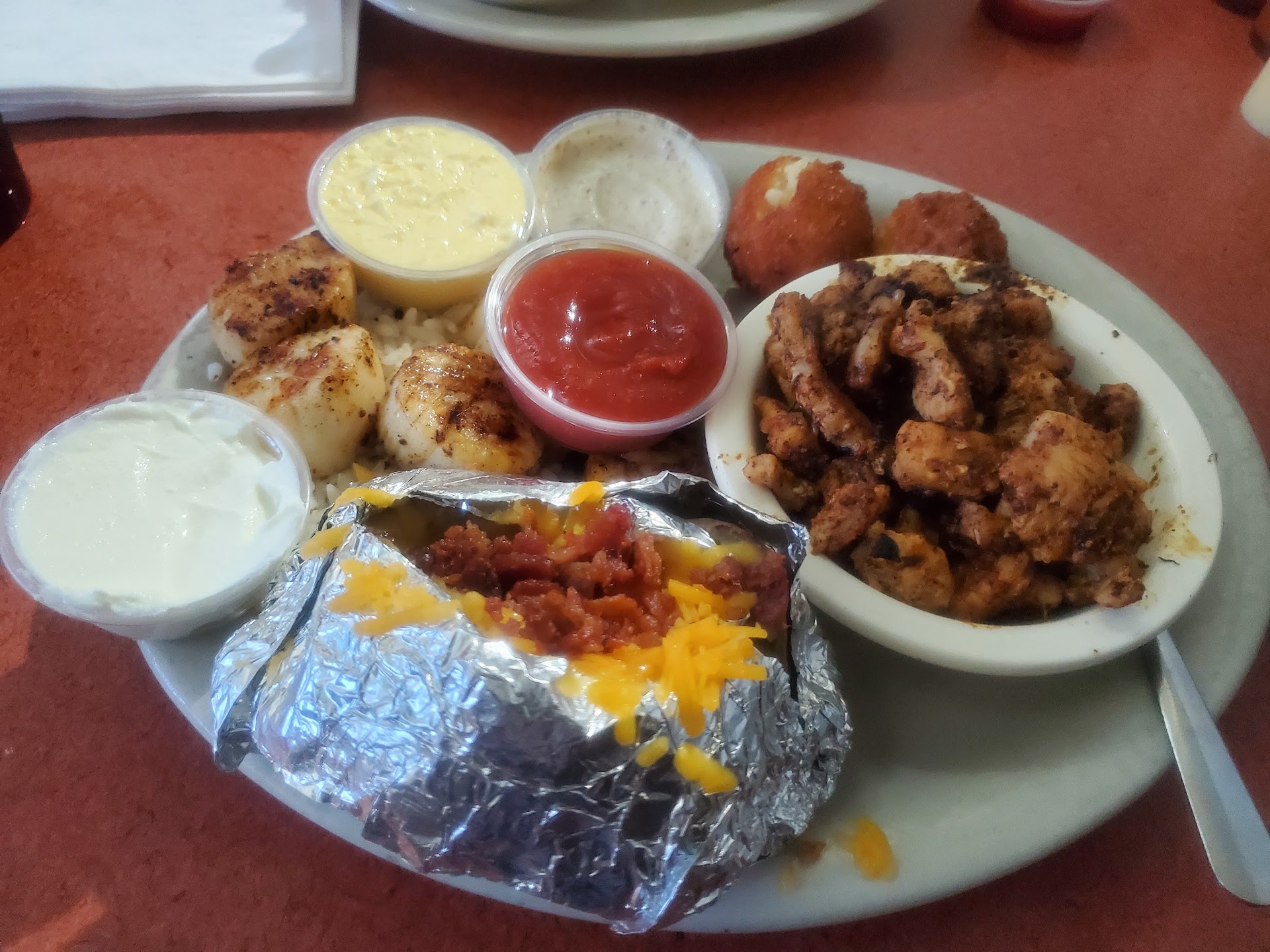 This was my Birthday dinner with a friend, it was my first time eating here! I've always wanted to try them but never got around to it. I've definitely been missing out!!! This place is not fancy by no means but it is DELICIOUS!!! They surpassed my expectations and I love being surprised. I'm not easily impressed. I ordered The create your own meal. I had fried scallops(on a bed of rice) and blackened gator bites with steamed broccoli and a loaded baked potato. Plus those hush puppies that make my soul happy! Now let's discuss those blackened gator bites. These were so GREAT that they come in 2nd place to the ones I ate in New Orleans(which says it all). My mom had never had blackened gator bites and she ate all my left overs. She could not get over the fact that 1) it's gator 2) it was so flavorful and juicy 3) the spice creeps up on you( but it's so worth it and I dislike spicy food) All my food was delectable but those Gator bites won the gold! Lol. For dessert, I had the KeyLime pie. I'm not a huge fan of KeyLime but I thought I'd try it. This had to be one of the best KeyLime pies I've eaten. It reminded me of the texture of NY cheesecake(creamy) with a kick of the tang from the KeyLime. My mom couldn't get enough of it, neither could I! Had I known I would have gotten 2 slices. My friend tried a bite and he was equally impressed. I definitely want to return and try their other options. I've had gator bites locally but this place makes the best one so far(besides New Orleans). This place is seafood heaven. Family friendly and affordable. My friend had the squash casserole and it was pretty tasty. I'm getting that as my side, next...