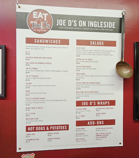 Ā Ā Ā Read moreMan I love some Joe D's! I used to work on Ingleside and Ingleside Pizza was my go to lunch place before I discovered this place! A friend of mine had told me to give it a try because it was one of Macon hidden gems oh, so I did. And thank God! I don't know if we are able to cook & package Jesus himself in these sandwiches, but I'm willing to bet that if we were able to, they would taste like they do here at Joe D's. The staff is always friendly (think chickfila type service) and the food is always amazing. Thinking of what to try? Try their loaded baked potato and...