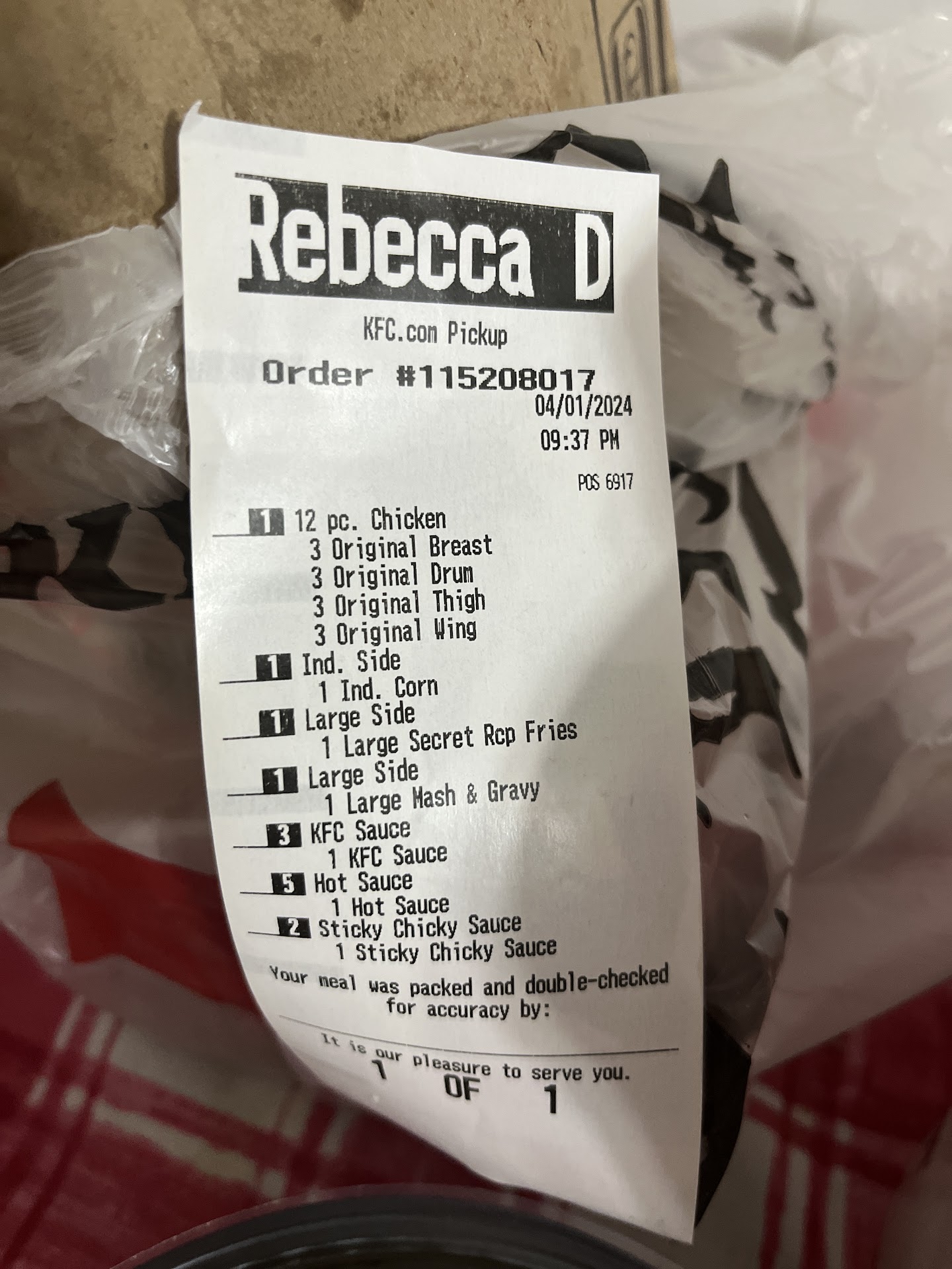 We ordered the DEAL 2 sandwiches 2 sides 2 drinks 4 tenders and 2 dipping sauces When my coworker came to the office we opened the clear bag which had 2 brown bags in it. In each bag was a sandwich and mac n cheese. we were like hey where are the tenders and sauces... So I drove to KFC where the order was picked up and the MANAGER was very RUDE... I explained what had happened and she said that she personally packed our order and she knew she put everything in there and she was not gonna give me the missing items ... one worker even told me that I would have to contact door dash to get it resolved and I said no I won't because this was not a door dash order... Finally after me standing there for about 15 minutes from start to finish the nice lady worker that works the counter handed me my 4 tenders and sauces and I left and came back to work to eat my food finally which by now everything is cold because of all of this... but hey thank you to sweet woman that was willing to help and provide actual customer service... the manager however I feel like she could use a training class in how to interact with people, I watched her talk with customers and she was so pleasant but with me, a woman who had a legit issue with her order, she was very curt and rude. I personally will not be ordering from that particular KFC... She made me feel like I was lying and out to get extra food when in actuality I just wanted the food that I had paid for. Customer Service and Good Food is what keeps the customers coming back and paying her paycheck and she needs to be reminded of that....