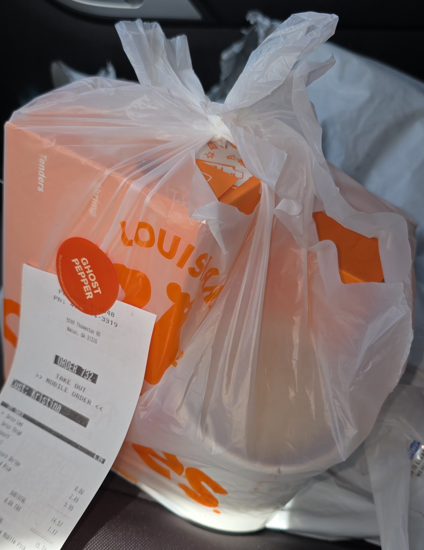 Read moreOh, man, this is what happens when I don't check reviews BEFORE hitting an establishment. I zipped into this Popeyes because it was on the way to a friend's house was convenient. The drive thru was empty when I pulled up, but I waited to get my wife's order via text. By the time I pulled in, there were three cars in front of me. It took no less than 15 minutes to get to the order screen, just to be told that they were "out of sandwiches"...you know, the #1 meal on the menu? *sigh So I ordered classic chicken strips with fries, BBQ sauce and a drink. ANOTHER 15 minutes and I get to the window. The cashier tells me, "I have your order, but tell it to me again." Huh? This makes me wonder if they're so used to customers just driving away that they've stopped entering meals until the last second, lest they have to cancel the order which corporate tracks. So I get my order and depart, and when I finally eat my chicken strips, they aren't classic, but spicy AND there's no sauce. *sigh Never again, Macon Popeyes...