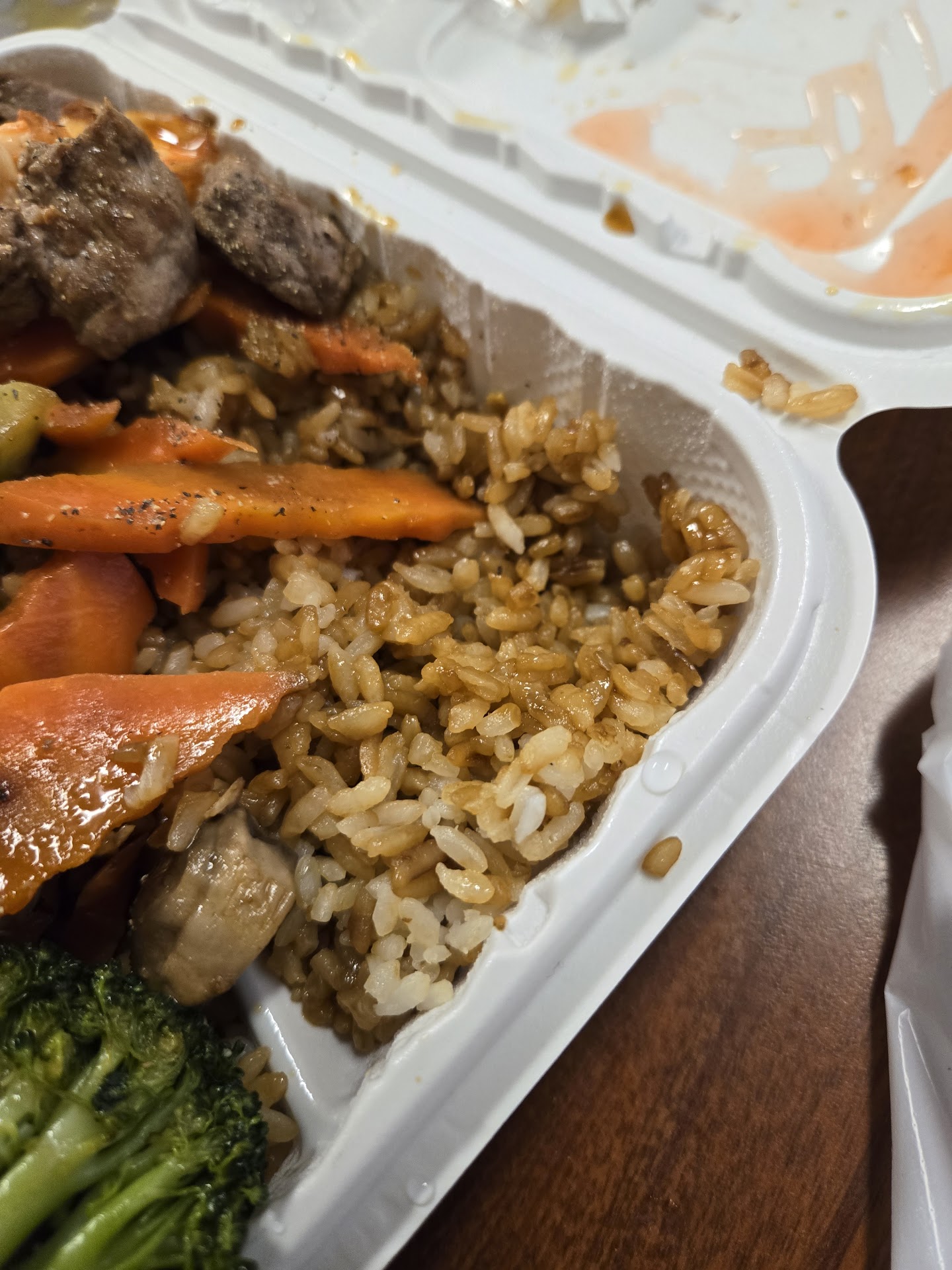 Read moreFirst, let's talk about the egg drop soup. The egg drop soup had zero flavor. I had to add salt and pepper to it to get anything out of it. It's really hard to mess up something as simple as egg drop soup. So the steak and shrimp teriyaki were $16. The steak was a cheap cut. I got it medium rare, and I was chewing on every bite of cheap roast that wasn't seasoned...not even thrown in a sauce...just cooked meat. The shrimp was rubber, which means it was frozen at some point "and" over cooked. Shrimp is the last thing you cook if it's in a meal. Teriyaki dish with zero teriyaki sauce in the Togo tray. I did get a "cup" of yumyum sauce. (what in the world is that? Mayonnaise based ginger?) And I got fried rice...zero egg in the fried rice...zero vegetables in the fried rice...it's just rice drowned in soy sauce. That's "not" fried rice. Other than that the meal was amazing. 👍 I'm glad we had seasonings and sauces when we got back...