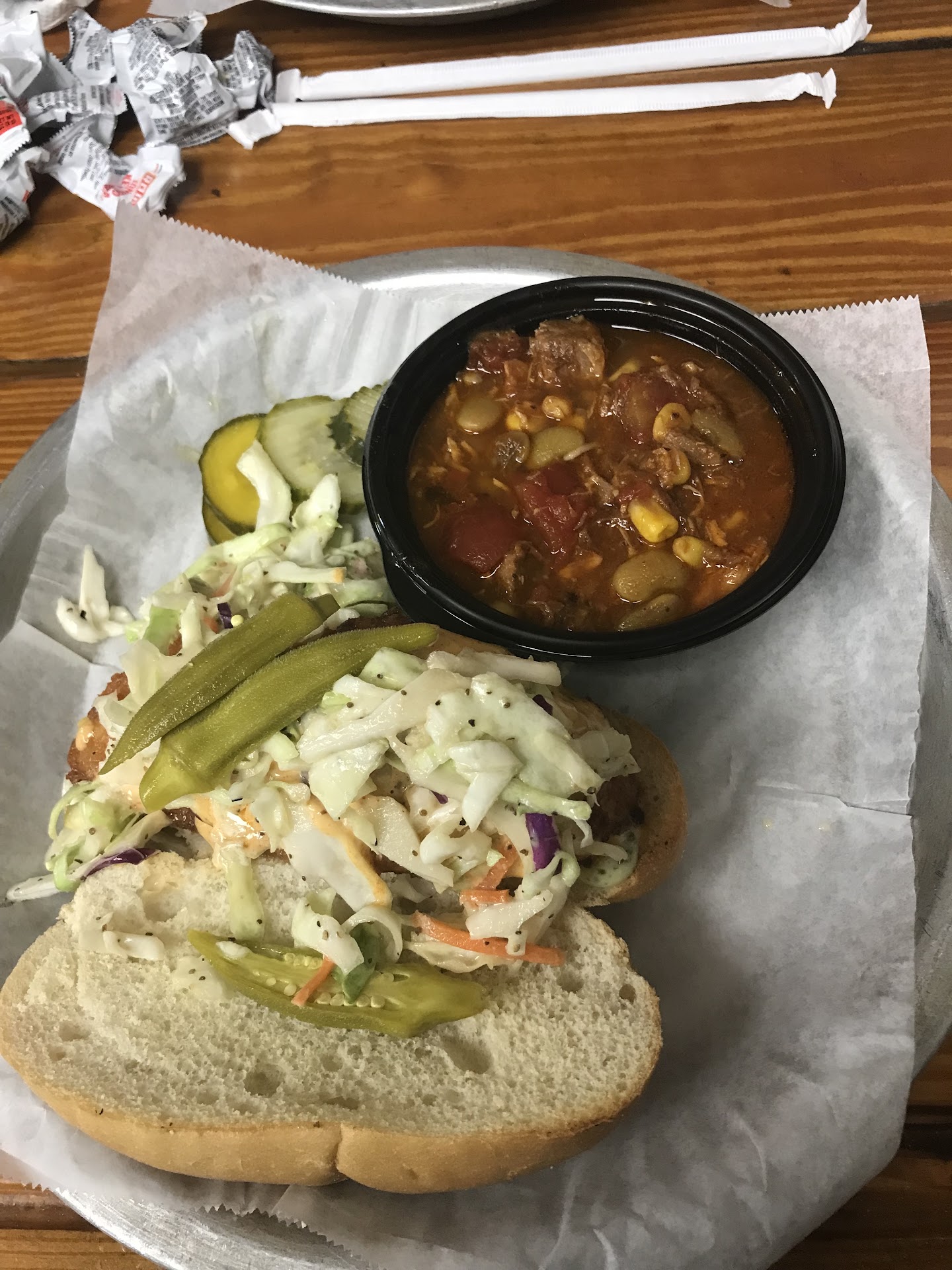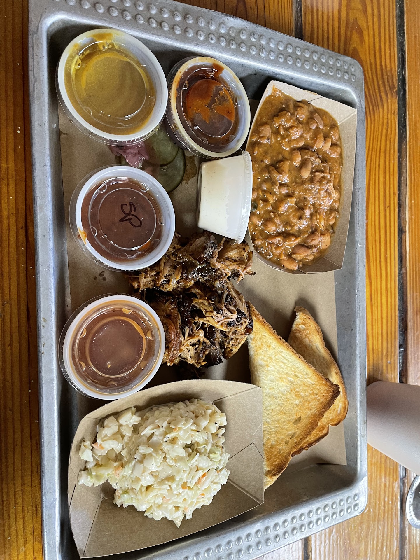 Read moreI hate to have to leave such a poor review as I’ve heard it hyped u only whole life but my experience didn’t live up to that. I came in at 11:45 right before lunch time and the restaurant was relatively empty when I entered but filled up as I ate. I ordered pulled pork, Texas toast, baked beans, and coleslaw; as well a dime of each sauce they offer. I’ll start with the sauces, the only one worth getting is the white sauce which was a very good example of such. The rest while well made were all far far too vinegary to do anything but drown out the flavor of the the meat. The sweet bbq sauce was tolerable at best though. (All sauces were tried alone and with the pulled pork) speaking of the pulled pork, it came out and while clearly well cooked and well pulled it was ice cold with virtually no taste. The baked beans were also cold and very thick but they were likely the best thing on my tray. The coleslaw was well made and tasted fine but that’s a matter of personal preference as I prefer a sweeter coleslaw. The “toast” was onto toasted in one side and had very little butter or good toasted color and also tasted of nothing. The vibes in side were very good and my service was wonderful but the food didn’t...