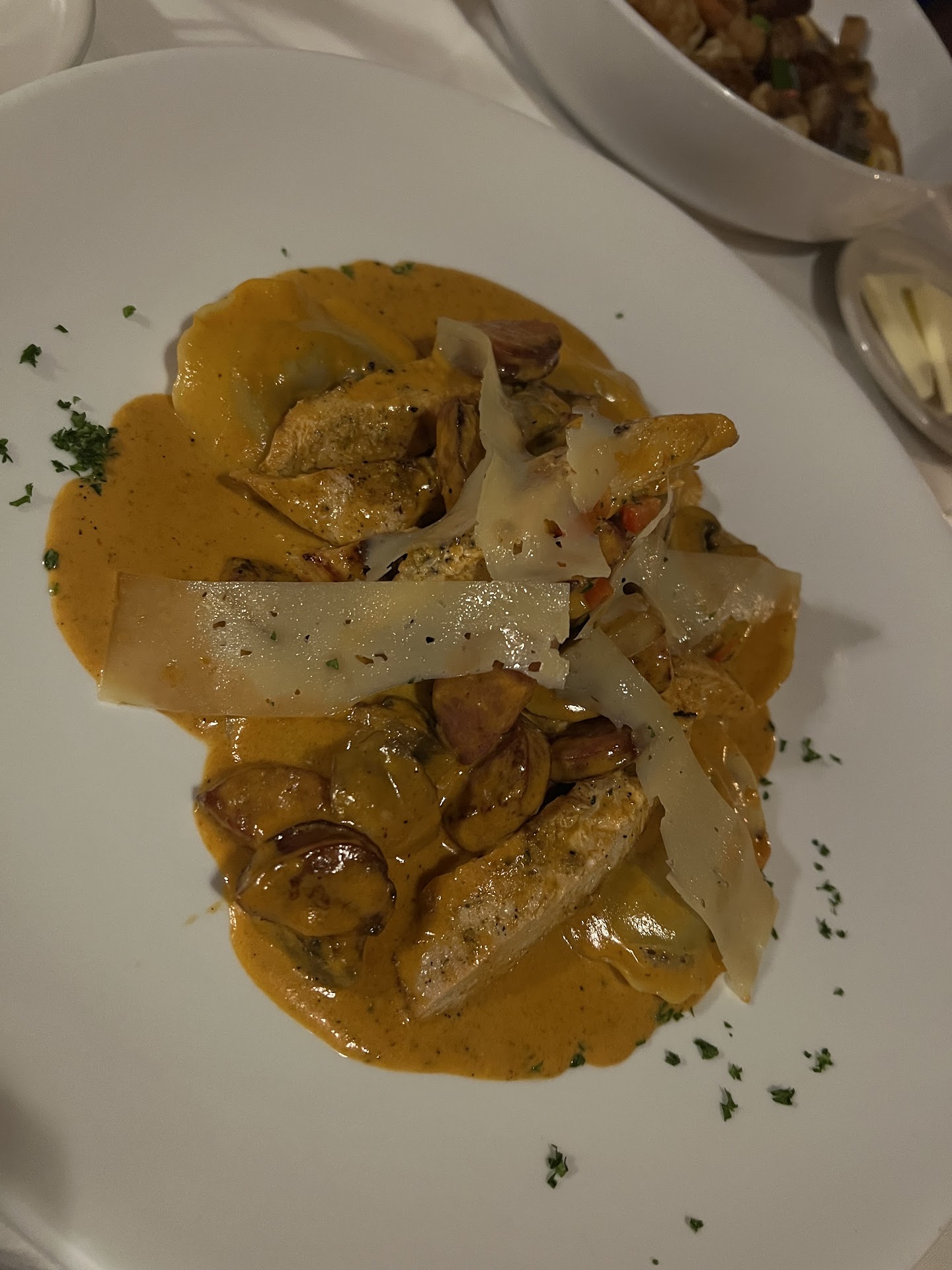 For our entrees, everybody but me had the Lobster Special which was served split, in the shell, and stuffed with Avocado Salad. They were humongous! The plates must have been 14 inches long and the claws were the size of my hand. The avocado salad was delicious, creamy yet crunchy from celery and cucumber. There was clarified butter on the side.