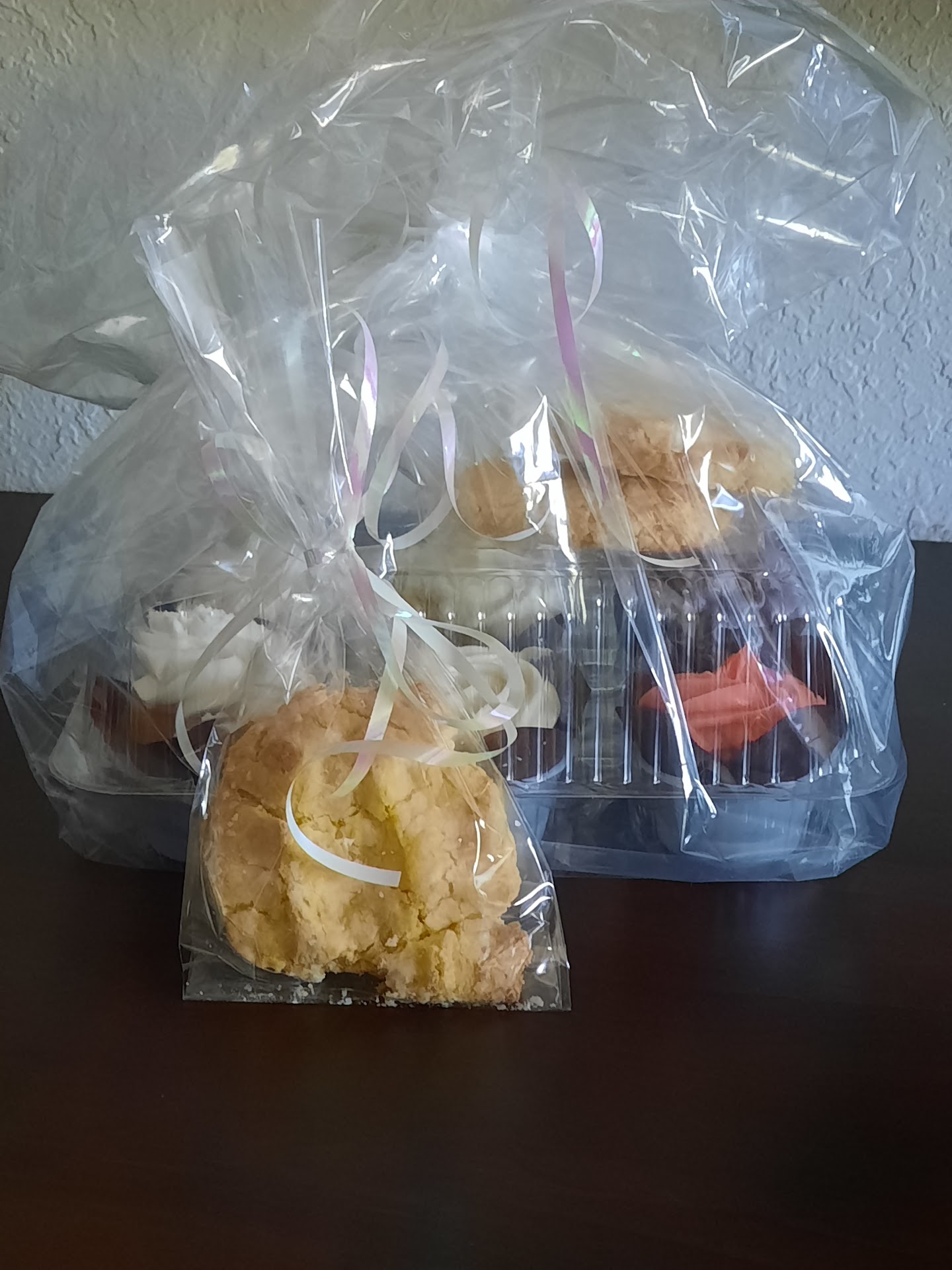 Review: the red velvet cake portion was more burgundy in color. I tasted cocoa (which I like), the cake was moist ,but it wasn't sweet, nor was there any taste of flavoring(vanilla, almond, etc). The cream cheese frosting did have a cream cheese taste, but it was too sweet (imo). The outside of the frosting was a crusty texture. So, that's either from air or too much sugar. Now, when you eat the cupcake as a whole, then it balanced out due to the cake not being sweet. The peach cupcake didn't taste like anything but...