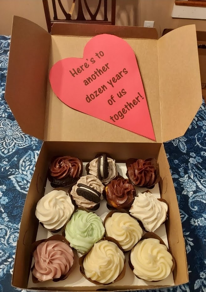 My hubby loves the cupcakes, so for our 12th anniversary, he got 12 cupcakes. I added a little heart inside the box, and...