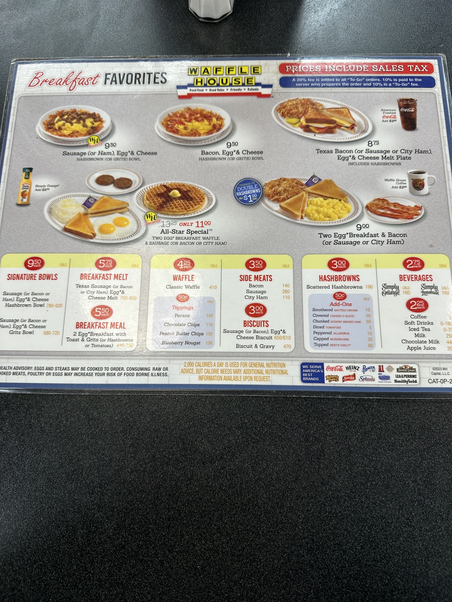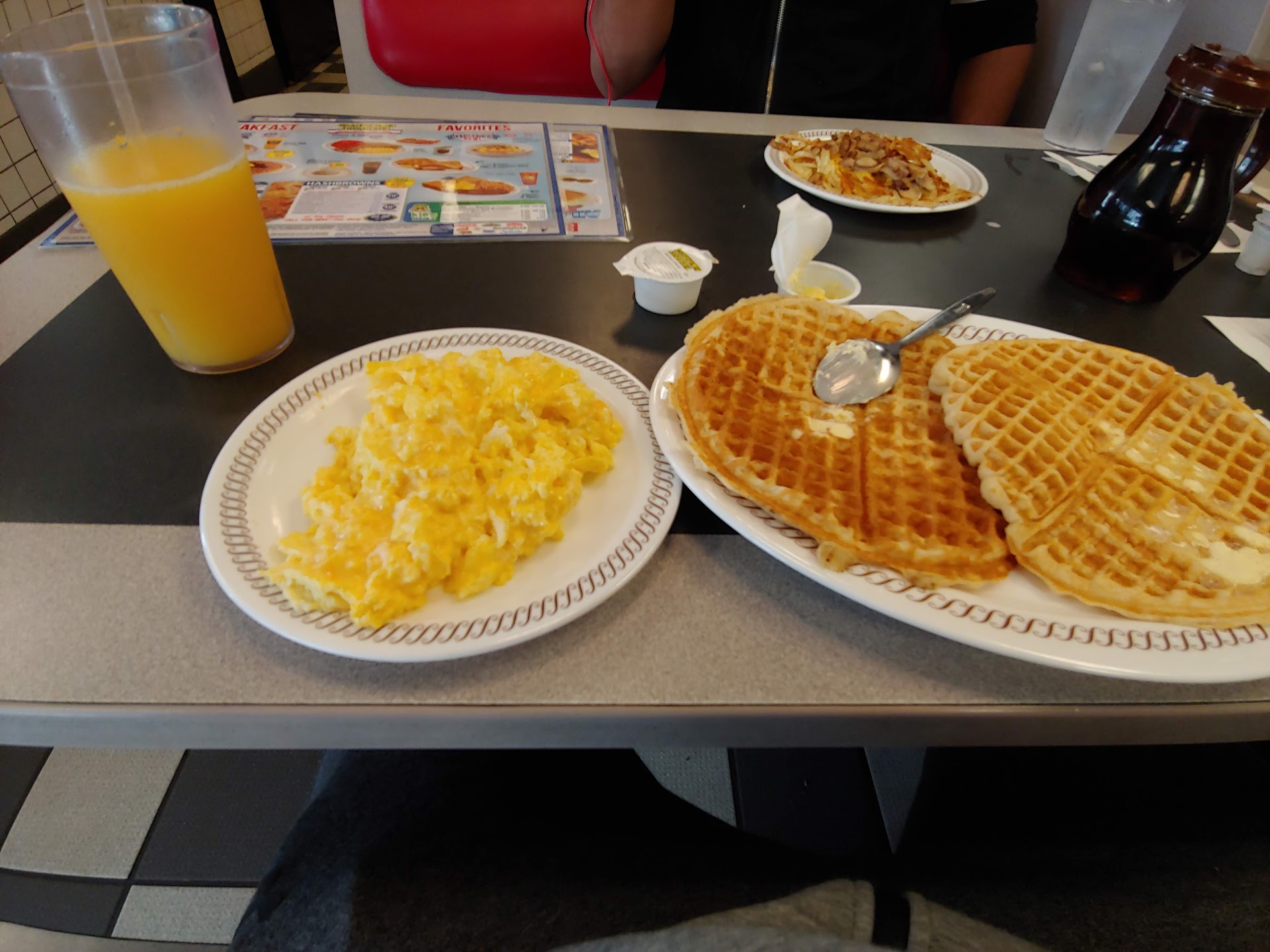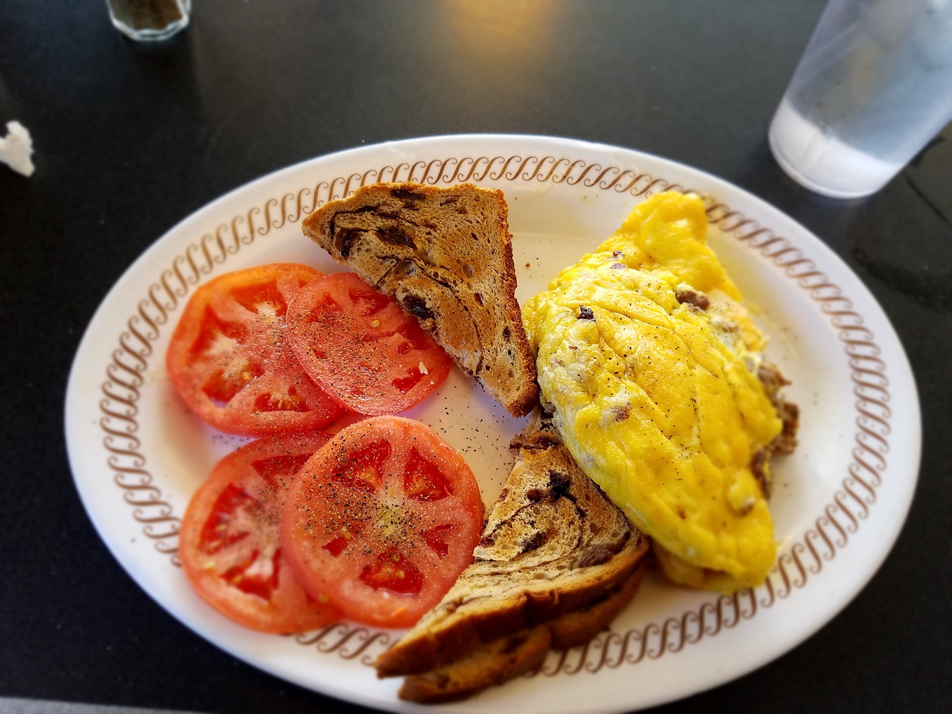 Food was ok. It was just fluffy eggs with chopped steak pieces and a slice of cheese inside. The tomato was just a tomato that could have been a bit more ripened. I had a glass of water with stuff floating around in it, so I didn't drink the water. They seemed crowded for a Monday, but it was Thanksgiving week (really not sure if that mattered). The staff seemed to be trying to move around and accomodate everyone. I was asked 3 times over a span on a minute in a half what I'd be drinking. Each time I said water, and by the 3rd time saying "WATER PLEASE", I was over it. When I got the water, it came with grits inside, or some other debris. All in all, nothing about this experience would have me rushing back to this Waffle House location. Oh, and it could have been cleaner in the kitchen/cooking area. The waffle station looked like 20 pancake bombs had gone off....