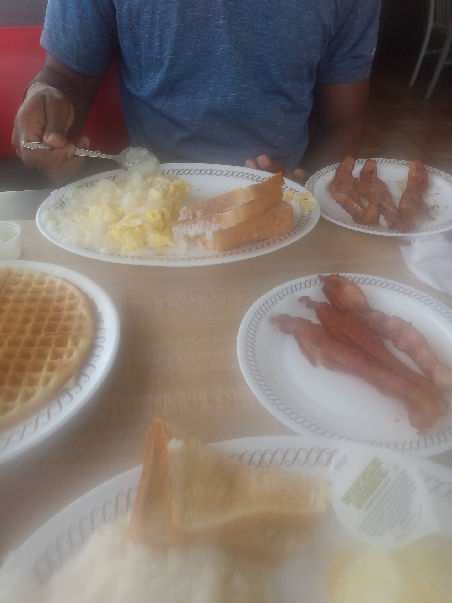 Read moreSo I decided to go have breakfast alone on my Birthday, cause why not? It's waffle house! I see atleast 3 empty tables and only one taken seat at the go around bar. NO CLEAN SEAT AVAILABLE AT EITHER. lady says take a seat anywhere and I ask her if someone can clean a space. She says your gonna have to wait a moment. I politely step back and watch for like 2 mins where one whispers to the other and looks at me. And eventually they get a girl sitting down in the corner to start cleaning up. I get a seat and order. Waffle comes mad before the rest of my Allstars breakfast and then my sausage never came. They asked, I told them. Still never came nor was dropped on the stove. Then when I asked again, they gave me someone's already cooked sausage straight out of their Togo box... I'm not trying to cause problems on my birthday but damn. Never again, please do yourself a favor and avoid this...