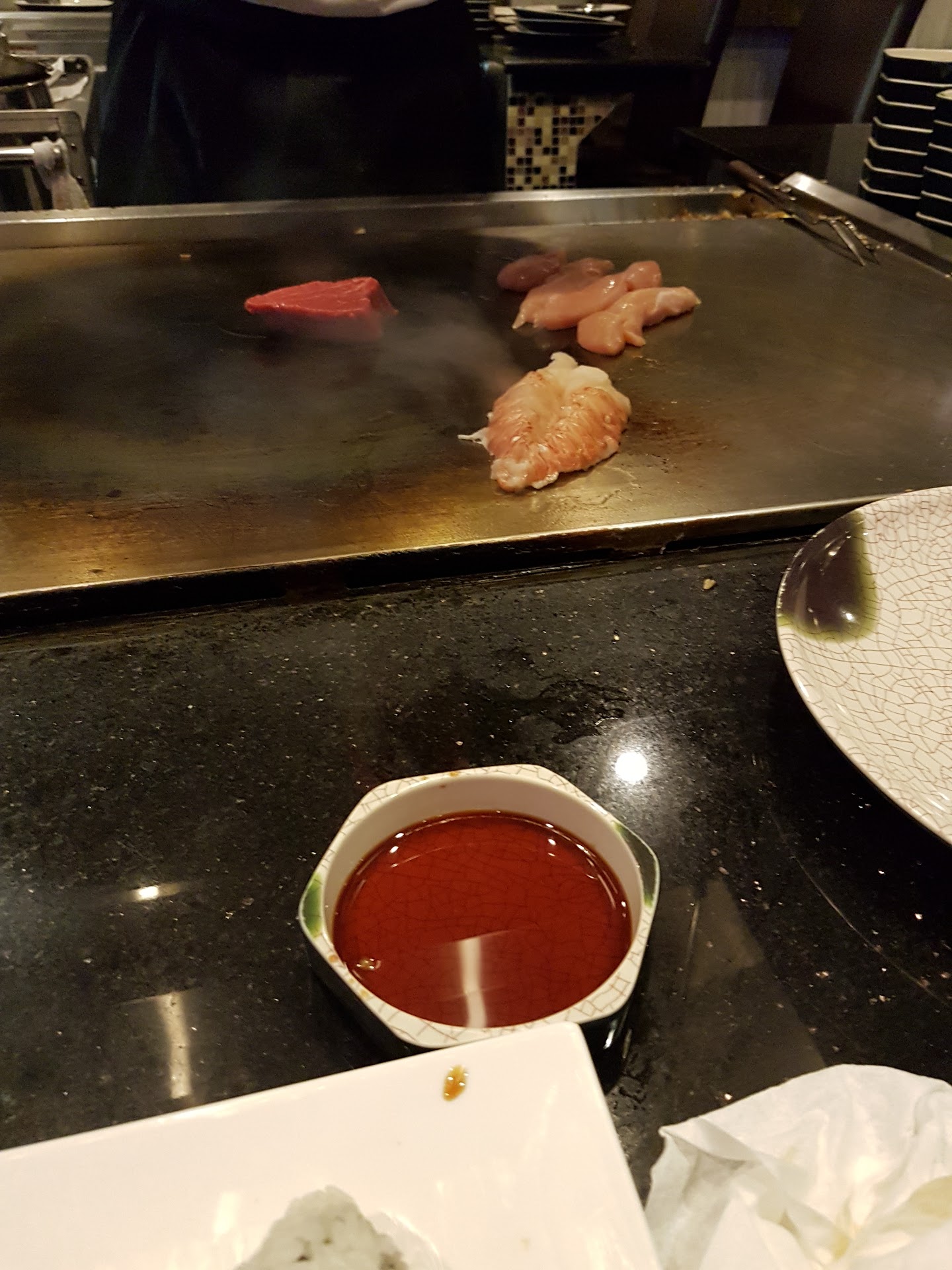 Tonight is a quiet Tuesday. When I came in, it was about 6 pm. There was only one other couple in the restaurant and their chef had just finished cooking for them so I was seated at the next hibachi table by myself. My order was taken (filet and shrimp combo) and I was served my soup and salad. Nice light broth and the salad was lettuce and grated carrot with a lovely sesame dressing. Then my chef came out to start his show just for me. I'm sorry I didn't catch his name. He said, "Watch your eyebrows" and made a huge explosive fire in the middle of the grill. Then he clanged and twirled his utensils and displayed his talents. Next came the food. A great variety of veggies, rice, noodles, shrimp and steak, cut with a very sharp knife and seasoned and served with precision. And oh, the dipping sauces--white for the shrimp and ginger/soy for the filet. Yum! We talked as he cooked and I found out he is from Korea, but has also lived in Miami and Michigan. Very nice young man. Excellent and tasty meal. It's a beautiful and clean restaurant with kind and soft-spoken staff. Please give them your patronage--you'll be...