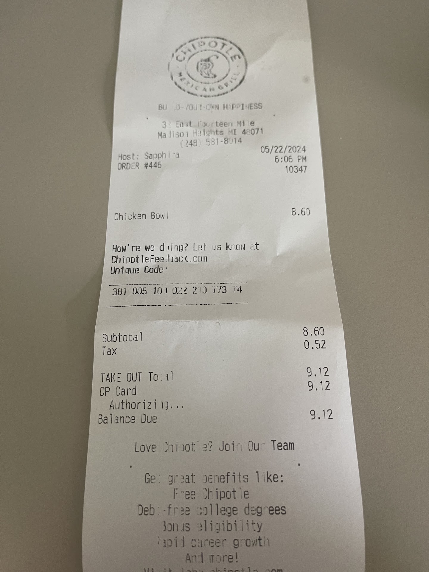 Read moreI have been eating at this Chipotle for 2 1/2 years and have decided to move on to another chipotle that is another 2 miles down the road. I won't waste time with the PROS you all know what you can get if a Chipotle store is on there "A" game. So, with that said this store is a "C" game at best. CONS... (lunch experience only) 1.) Fajita veggies you will not get 95% of the time they don't even bother to cook it, it seems. If you love your veggies forget this place at lunch time. 2.) Duration to get food is very long, they frequently have one person making the food at lunch rush hour and you look over to the Online order area and it has 2 people meanwhile the line is out the door. 3.) debit card reader is always having problems reading and they have to rub the machine talk sweat to it and maybe it will work. I did receive a free lunch onetime as I didn't have cash on me and the machine wasn't accepting my card (note: I don't have problem with my card anywhere else). 4.) unorganized as there are people running around back trying to keep up with servers who are already short one person. 5.) Clean table is hard to find as they don't come wipe things down although it may seem lately, they are working on it.