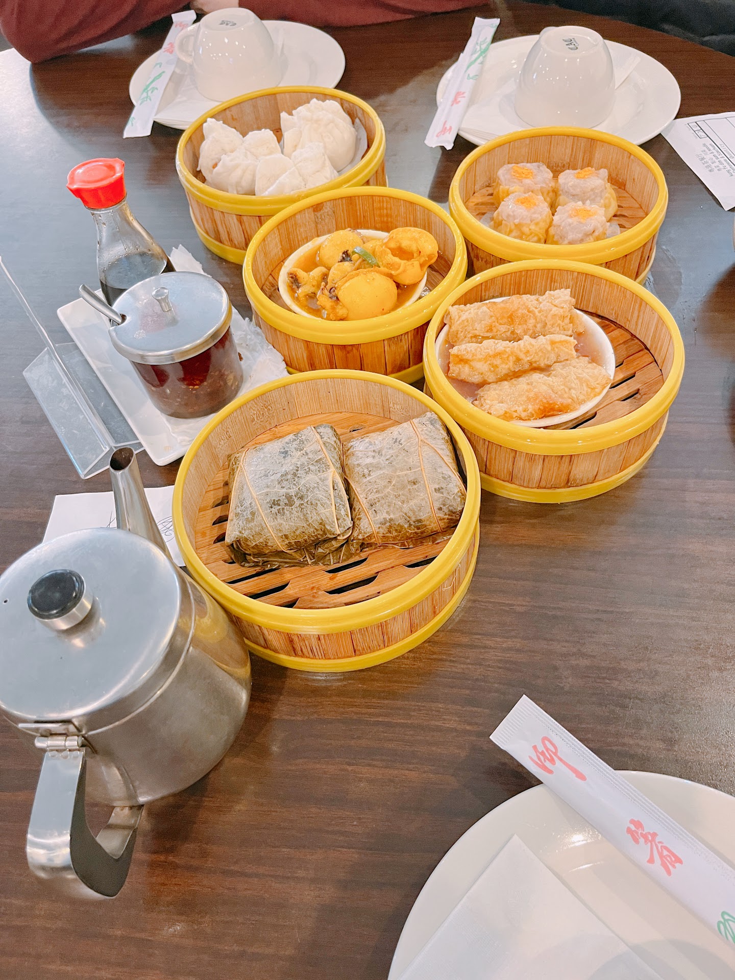 The hargow, siu mei, cha siu bow, braised chicken feet, lor mai gai (lotus leaf wrapped sticky rice with chicken), and tripe all tasted VERY good and is, so far, the BEST flavored in this city. I also really dig the good tea selection, which for OG dim sum-goers, is essential to good dim sum experience.