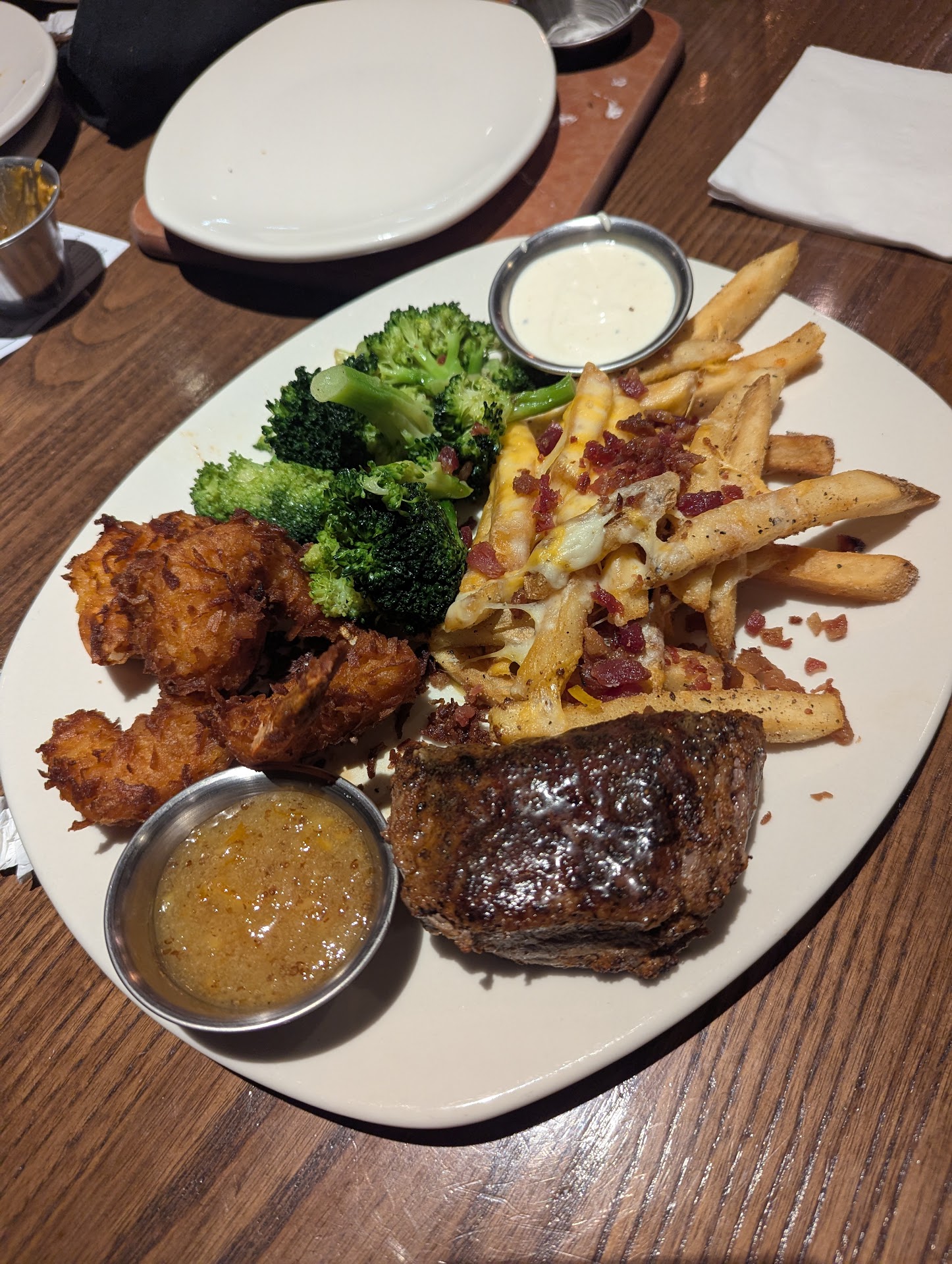 Read moreDisappointed. Usually this is my preferred location but tonight, it wasn't it. I arrived at 8 pm, 2 hours before they closed and didn't leave until after they closed due to how insanely slow the service was and neglect from our server. The dining room was so cold. We were sat at a booth by the windows and it was the biggest cold draft. I spent the whole time with my jacket on, trying to eat dinner. My legs, hands and face were ice cold. I felt a wave of heat maybe twice. There were only 3 people in my party and a table of 2 and 6 were seated after us. Their orders were also taken before ours. We were asked for our drink and appetizer order. We were also asked if we were ready. My friend needed just one more minute and then our server didn't come back for a good 20 minutes. Once our order was taken, it took over 30 minutes to get our food. By the time we got our food items on our plate was cold. Since we got our food around 9:35 pm, I wasn't going to complain about it because I know if we did, it would take even longer for a new meal and it would probably would have been rushed to be made. My sirloin was pretty salty. I had to cut the outer part and only eat the inside. My fries, I asked for cheese and bacon to be added, like the Aussie fries appetizer. It came out luke warm. The cheese should be melted and soft, not hard as a rock, as if it was microwaved too long. I stuck a fork in my fries and was able to pick the entire chunk up. Fries were just covered in salt. My broccoli was cold so overcooked that I was able to mash the stem of it, without force. My coconut shrimp was the only thing on my plate that was decently warm. Now I don't know why the mark was missed but the restaurant was not busy while I was there so I don't understand why the meal was cold. My friend's ribeye was also cold. The waitress came back and checked once before we barely got a chance to start eating and then she came back with our bill. By that time, it was 9:50 pm and they were getting ready to close up. I wanted to just pay and leave but it took another 15 minutes for our server to come back. I've never experienced such horrible service at this location. Not 100% sure...