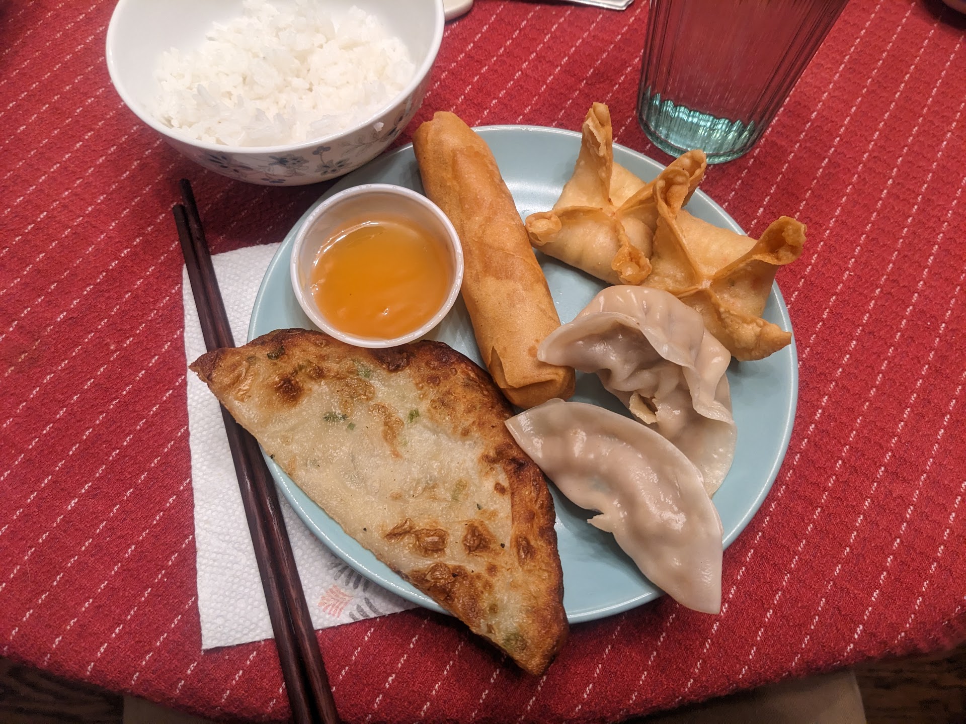 I ordered the shrimp dumplings, which reminded me quite a bit of the ones I get in Hong Kong, so, bonus. Lots of filling here, too. The crab rangoon is hands down the best I've had from a restaurant probably ever. It's the real deal and absolutely delicious! Oddly enough, the green onion pancakes had the lightest of flavor. I'll probably try something else like the Spring Rolls in lieu of the pancakes next time. And there WILL be a next time.