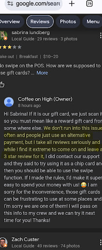 Read moreHere I am on a Monday searching google for a new place to try since Coffee on High is closed- and I was astonished to see COH does not have a 5 star rating. This is my favorite coffee shop and the owner is one of the kindest people I’ve ever encountered! On Sundays & Mondays we always try new places -Das, Porters, Staufs, 7 Brew, L City, True North… there are countless wonderful little shops in central Ohio. We’re blessed! But there’s a reason why Tues-Sat we return to COH. So many options and varieties of drinks, food, and desserts. A clean, comfortable environment with great ambiance. Games to play! A few items from local vendors. Friendly people! I’m sad to see someone respond with a 1 star review out of their own inconvenience that really wasn’t due to any fault of COH. I looked at the complaint and her screenshot and I didn’t see anything wrong with the response. If this person has truly been in a restaurant business for years they should have more grace and understanding over something so trivial. Small business owners have it hard enough without people giving knee jerk reactions that could negatively affect their business. I’m glad that every time I enter I see a lot of other regulars ~ COH is a great attribute to CW and I pray they continue to be blessed, just as they...