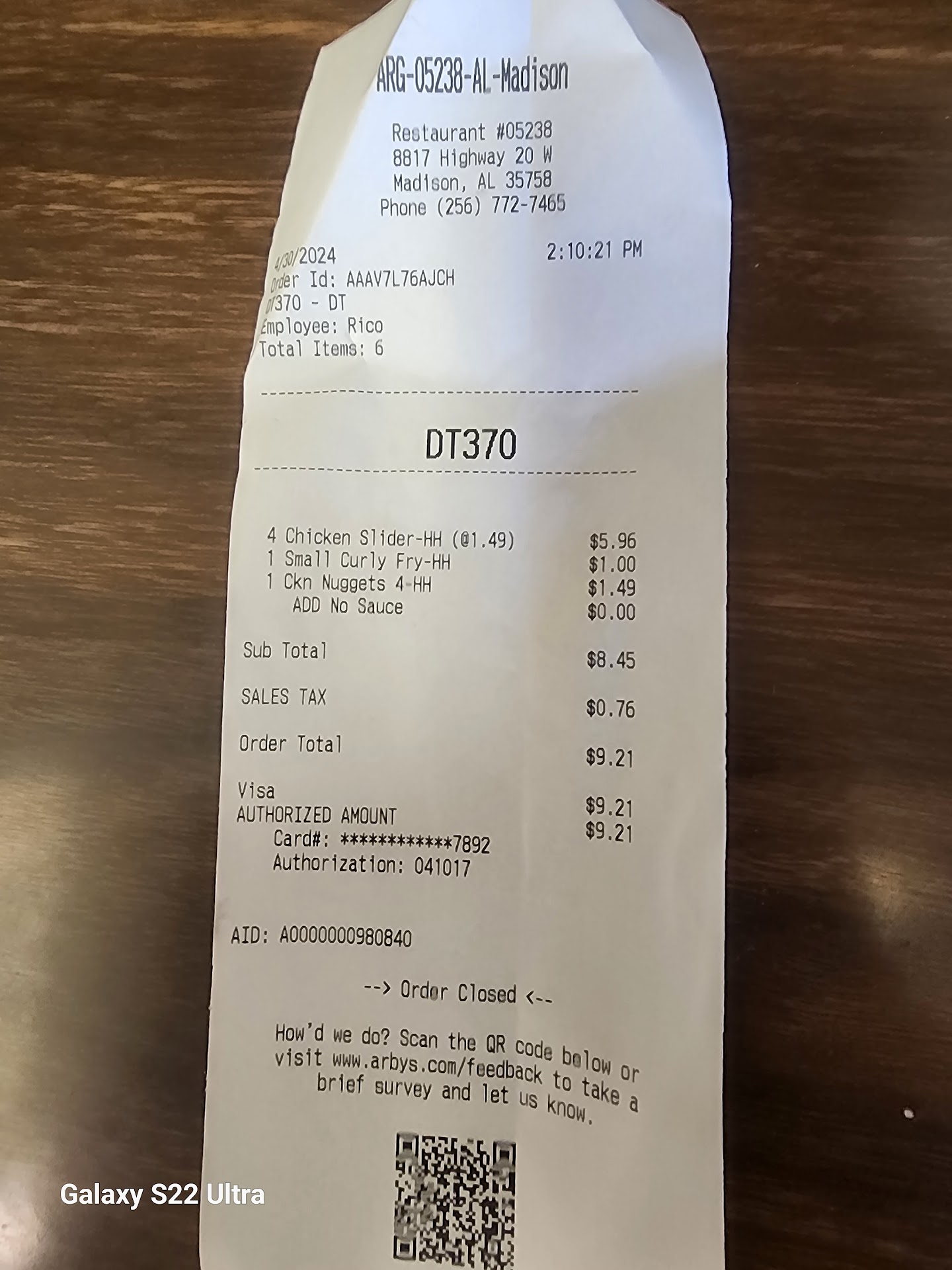 Ā Ā Ā Read morePulled in to restaurant and went right to the drive thru speaker. No cars in front of me except for one that seemed to be just waiting for their food on the far side of the drive thru window. After waiting around 5 minutes at the drive thru menu/speaker I placed my order for 4 plain chicken sliders, a small fry, and 4 piece nugget at exactly 2:10 pm. I proceeded to the window where my credit card was quickly charged and I was informed to pull forward into a parking spot and my order would be brought out momentarily. I watch several people that have arrived and ordered since me come and go after getting their food. Than at 2:36 pm an employee finally comes to my window and gives me my order. I proceed to check the order to make sure I have everything and unfortunately I have 4 sliders, a small fry, but no 4 piece nugget. I then leave the vehicle to go inside to get my nugget order that was missed. No problem, stuff happens. Shouldn't have taken 26 minutes for such a simple order but what do you do. I tell the same employee that delivered me my order that I didn't receive my nuggets. He asked me what size, to which I answered 4 and he proceeds to serve up my nuggets into the little paper box thing. I take my nuggets and leave. Not happy by any stretch but not irate either. Like I said before, stuff happens. I leave the restaurant, get back to work and of course have no time to eat my lunch because I spent the entire time waiting on the food. When I do finally get to eat my lunch, the damn dude only gave me 3 nuggets and my damn sliders were covered in Buffalo sauce which I can't stand! Between waiting 30 minutes for such a simple order, not getting what I ordered without a second visit, an employee not being able to count to four, and ultimately almost the entire order being wrong and not what I even ordered; I am done with this location!!!! Absolutely despicable! And whoever owns this restaurant should be ashamed for putting such a horrible product out there...