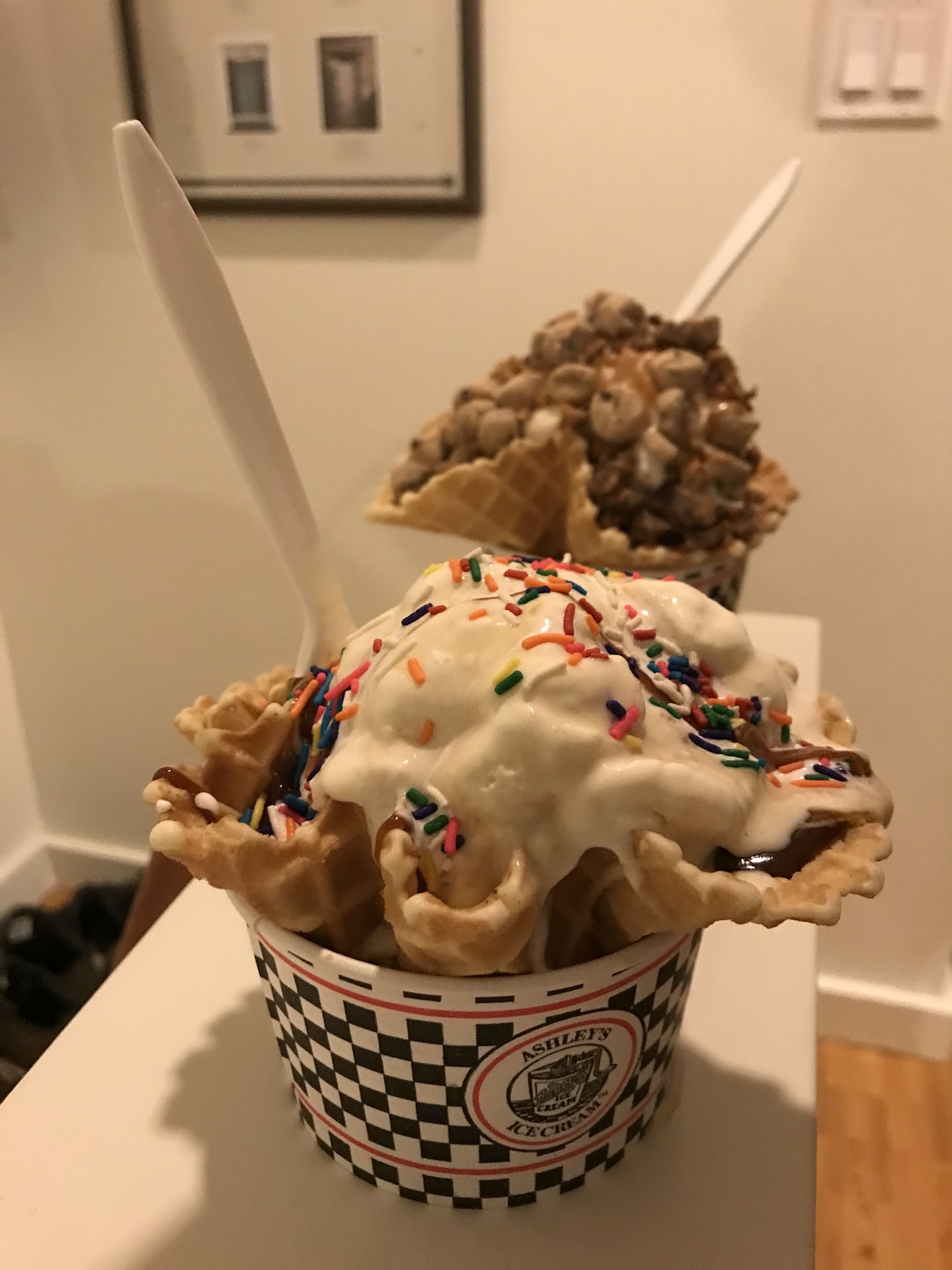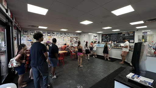 Visited on a brutally hot day and the line was very long. Surprisingly it moved very quickly with only 3 people working the counter. The ice cream is creamy but not heavy. Lots of fun flavors. They are happy to let you try some flavors before ordering. I was glad I tried Bourbon Brown Sugar- sweet and totally delicious with a hint of bourbon, and I donât care for bourbon. I ended up getting a regular cup of chocolate chocolate chip. Loaded with chips and perfect chocolate flavor. In a regular cup you can get 2 scoops and can choose 2 different flavors. So many toppings to choose from And the cakes looked fantastic. Several tables inside and you can sit and enjoy looking at all the fun pictures people have drawn to celebrate Ashleyâs. Or sit outside- many benches, chairs and tables. Plenty of free street parking and there is a large lot behind the store....