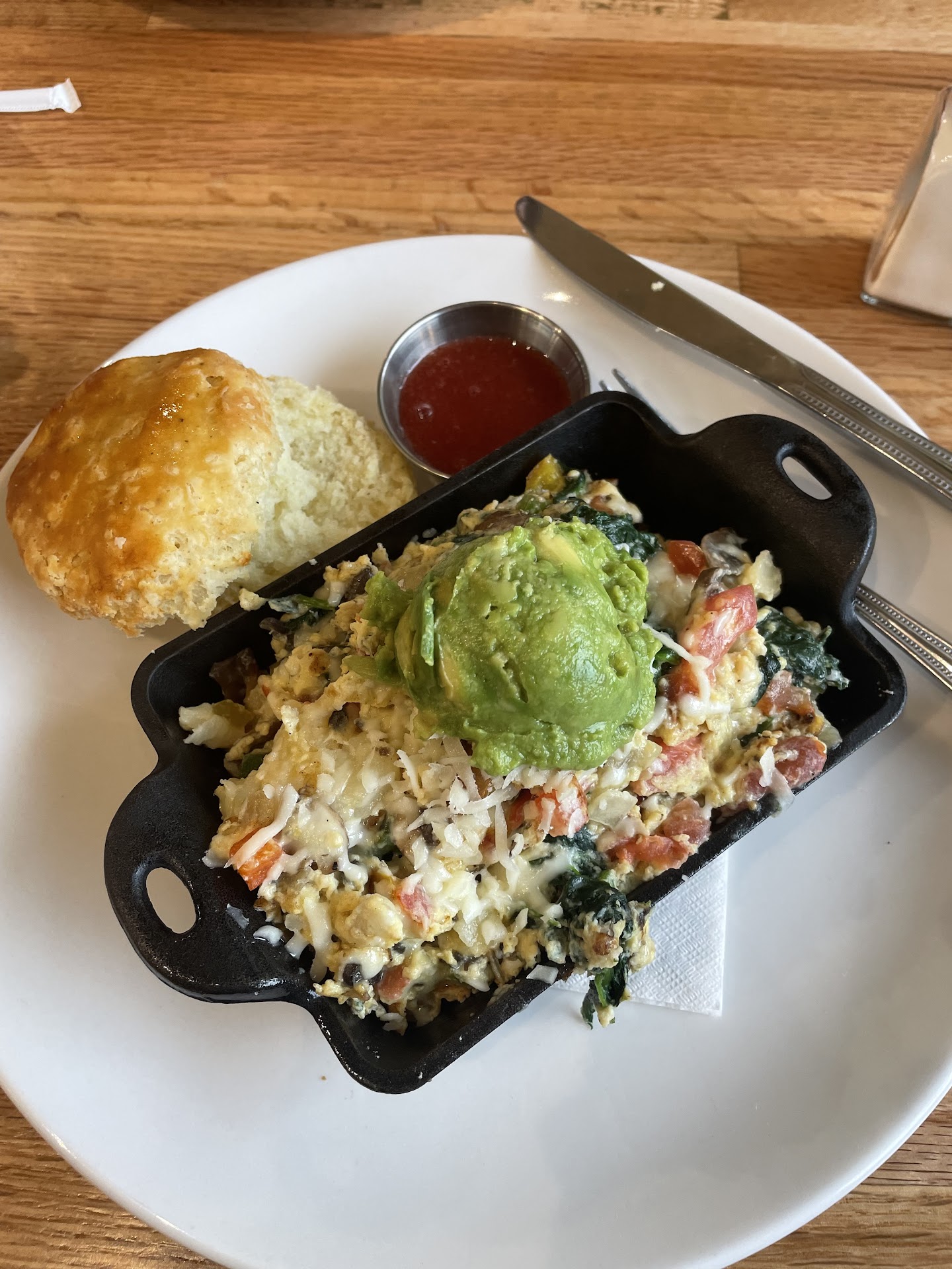 I have kind of been on a lean diet so I ordered the Yard Work Skillet which was listed as even lower in calories (560) than most of their “lean plate” offerings. It was packed with scrambled eggs, fresh avocado, spinach, tomatoes, bell pepper, onion, mushrooms, and potatoes. It was very good and very filling. I probably would have enjoyed it even more with some good bacon in it but, then again, bacon makes everything better! I’m sure they would’ve added the bacon if I had requested it. I had my choice of white or wheat toast, or a biscuit. I wanted to try the biscuit even though it was a little over my diet allowance. It was good - could have been a bit fluffier and softer- but still tasty. The fresh strawberry homemade jelly that came with it was a nice touch.