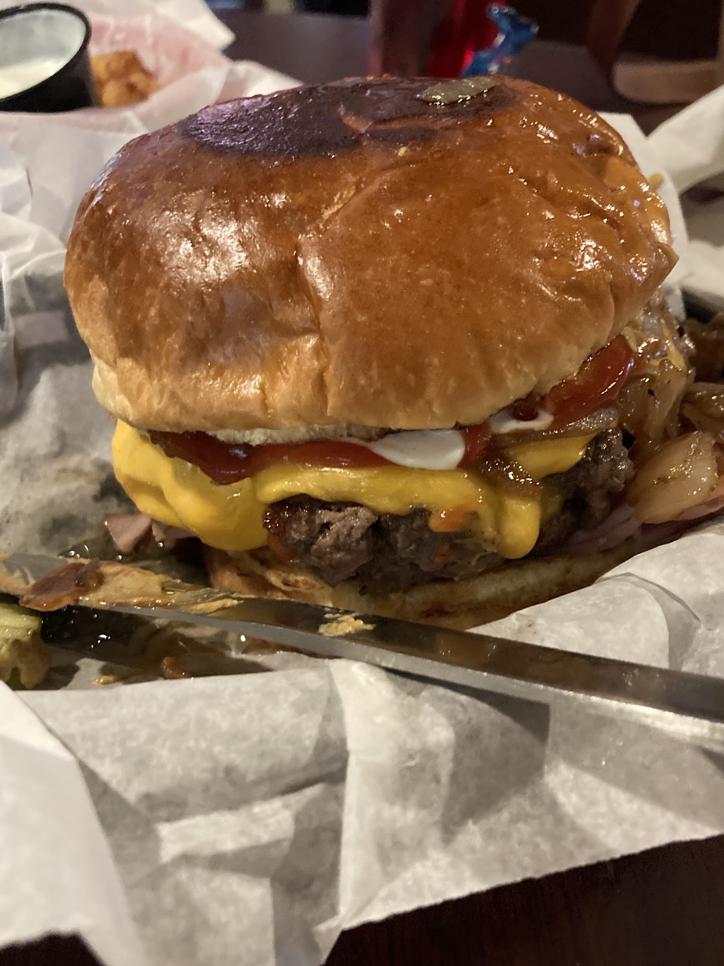 The burgers were big. We had to cut them in half to eat them. The burgers consisted of the burger patty, three kinds of sliced cheese, thin slices of deli ham, and fried onions. The waitress stated that the burgers would be a little pink in the middle, they were not. They were a little over cooked and dry. The patty itself didn’t have any flavor. The burger as a whole was good though.