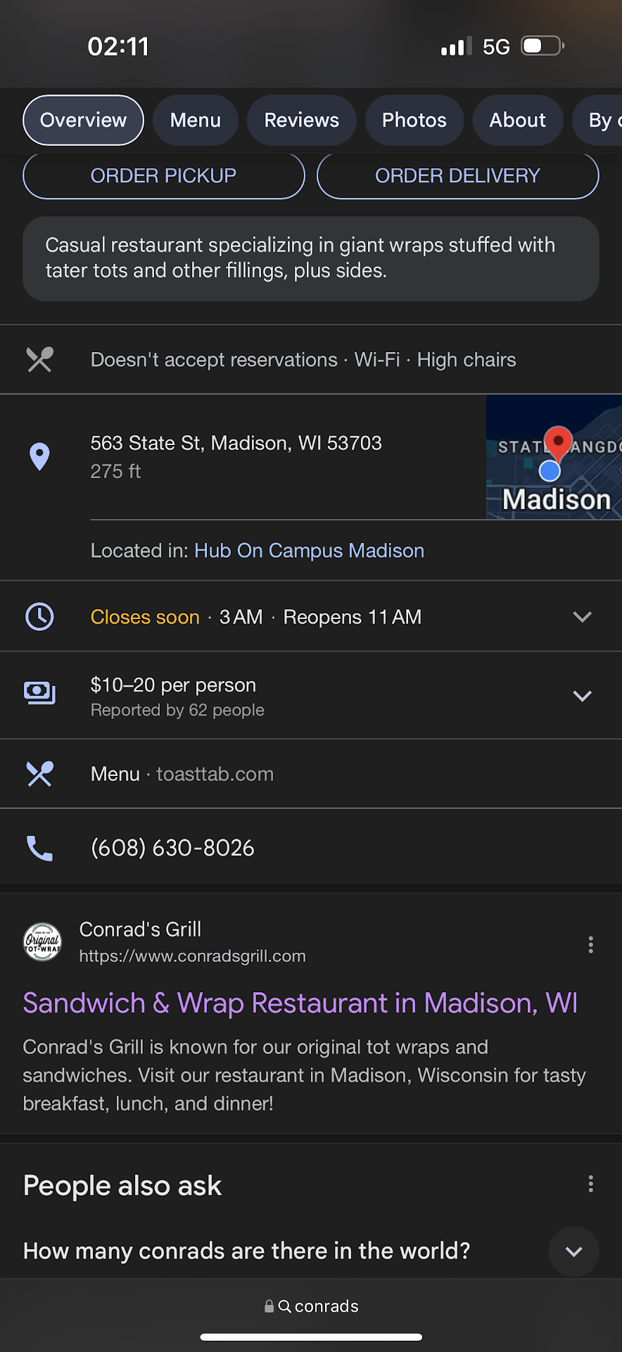 Read moreI ordered Conrad's from Uber Eats last night and even though my experience with Uber Eats was negative. My experience with the restaurant was almost perfect.