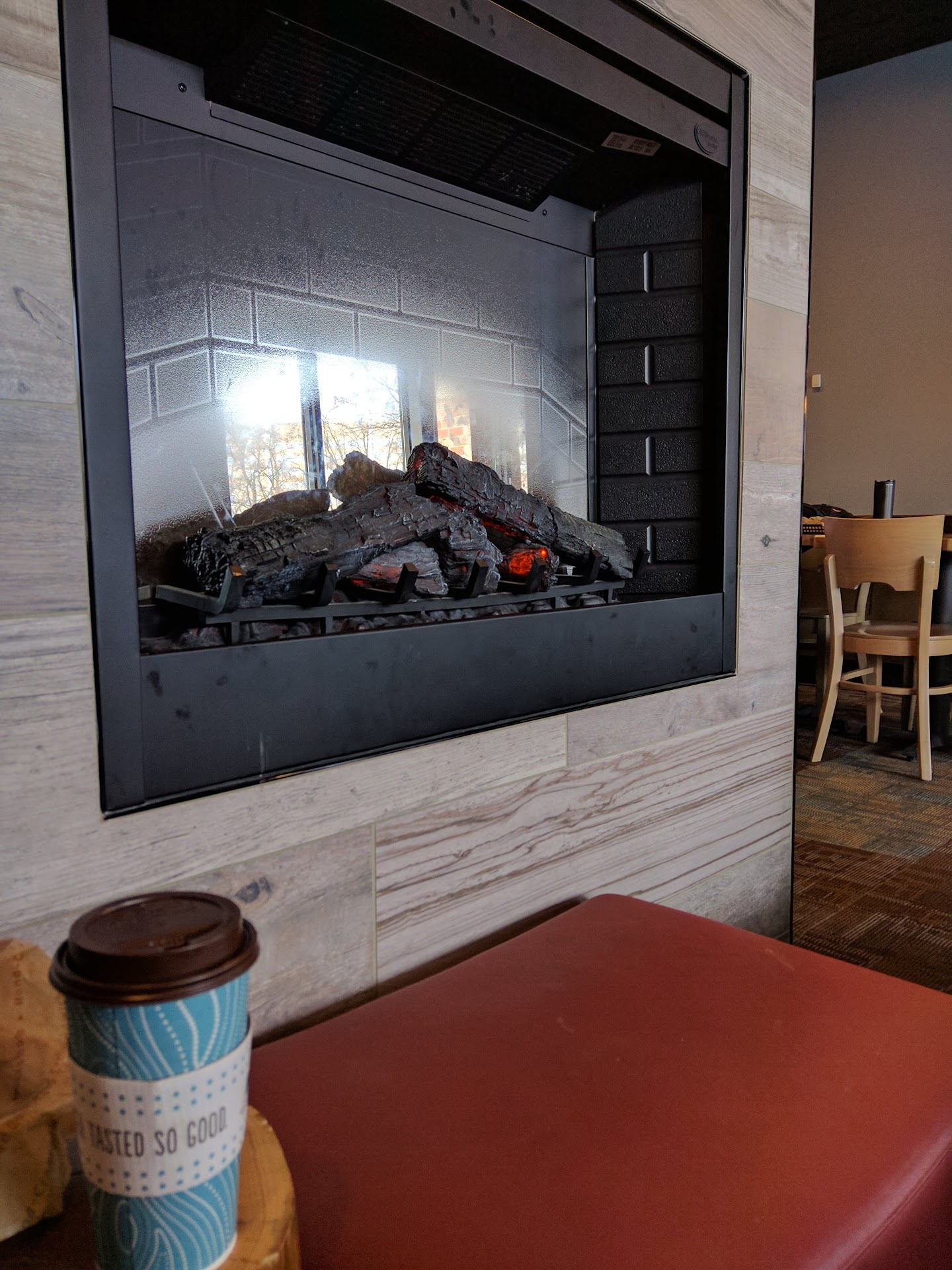 Read moreI frequent the Einstein Bros. Bagels on 2701 University Ave. in Madison before and after my shift at my workplace nearby and everytime I come I am I astounded by the level of quality in the fit and finish of the cafe/lounge area. The crown jewel of this location is the beautiful electric fireplace finished in an ash wood veneer rising through the ceiling. I am partial to the arm chairs closest to the fireplace and enjoy the warmth ruminating from the fireplace after a long commute/shift. The chairs are extremely comfortable and the environment is welcoming and cozy. I have many coffee/bagel shop options here in Madison however none of them offer such an atmosphere as pleasing as this. I will also add that they play great music through an excellent sound system at an appropriate volume, which is...