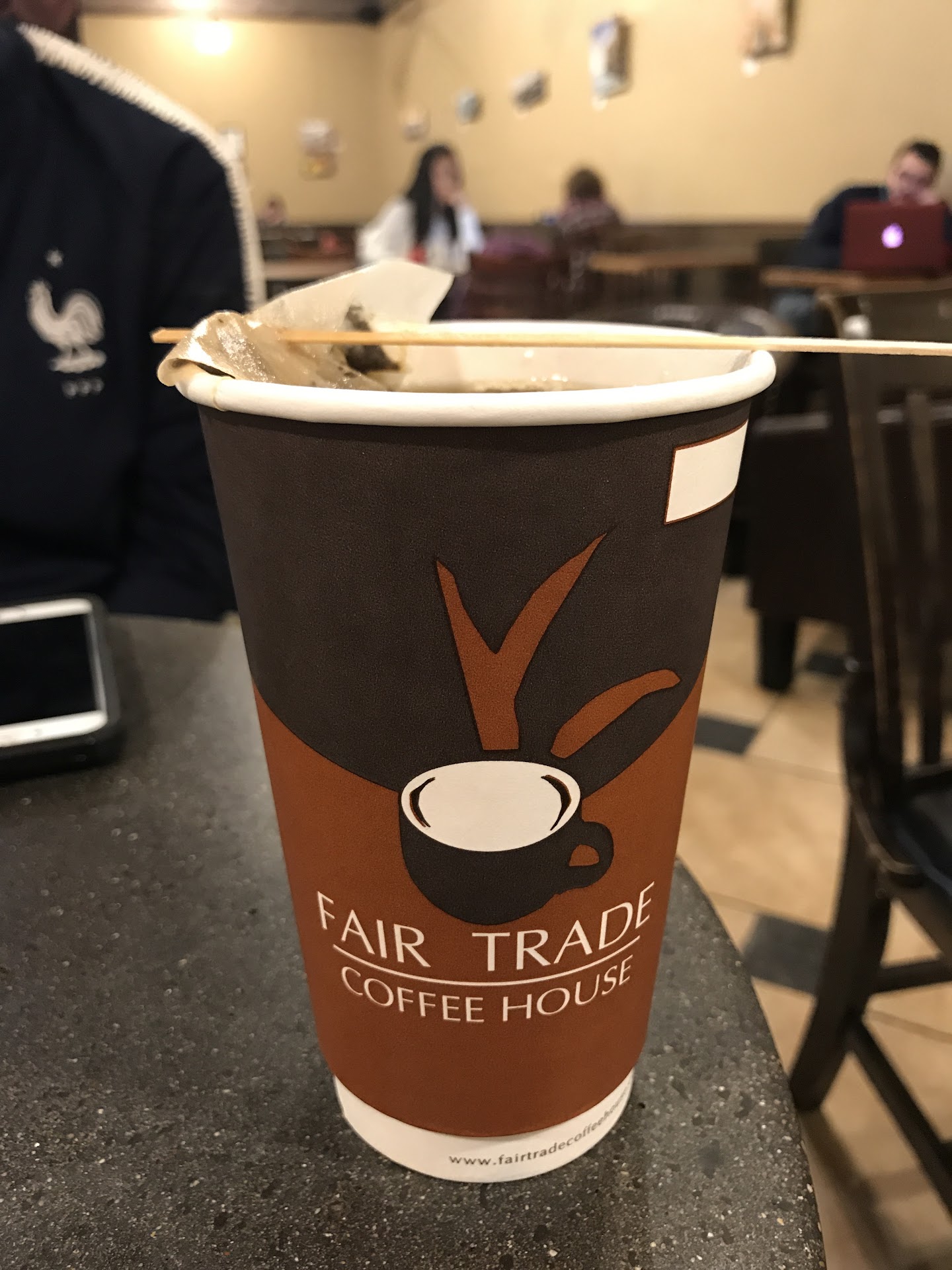 The employees were less than impressed. I soon after went up to the counter and asked for a Togo cup to put my coffee in, and a male cashier treated me like I was a burden and truly just so bothersome to the establishment that I help a respectful, quiet, paying customer pay for food to go with his drink.
