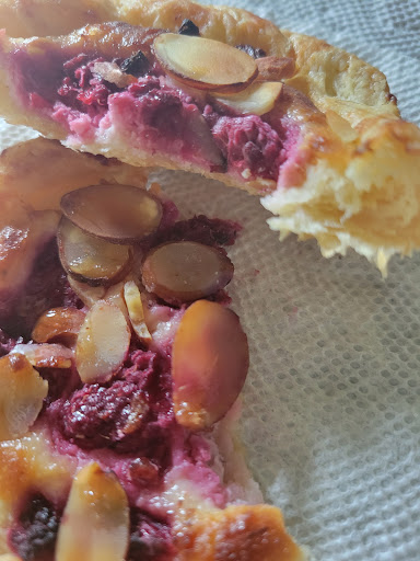 We picked up 9 items yesterday/Saturday. The two raspberry galette we tried today tasted and appeared anything but fresh. One taste and we passed/tossed them. Went to the cinnamon-sugar morning buns, which looked beautiful. The centers had a kind of custardy/eggy-wet-dough consistency and flavor that was definitely new to us. Unsure if that's a style? but we're not custard/creme brulee/cooked egg people so two more hard passes after we again each tried a bite. Not knocking those in case they were intentionally made as such, but they, too, went into the bin. I moved on to a carrot cupcake. It was pretty good but again tasted and felt seriously (EDIT 3 mos later, missing word: less) than fresh. Even the frosting was dry. I'm a huge carrot cake fan and have tried soooo many. Loved or very much liked nearly all of them. Finished half of this one because I was hungry. My husband is reluctant to even try the (orange? lemon? we forget) cupcake that was in the cool case next to the carrot cupcake. The very nice person readying our items said it was "about a week old but should be okay because it's covered in frosting." I looked at my husband and he said he'd try it. So we bought it. I did not ask but more importantly they didn't offer to reduce the price at all. After telling me it was about a week old. My husband thought the little shortbread cookies were good, and we both liked the seeded chocolate chip/almond cookies quite a...