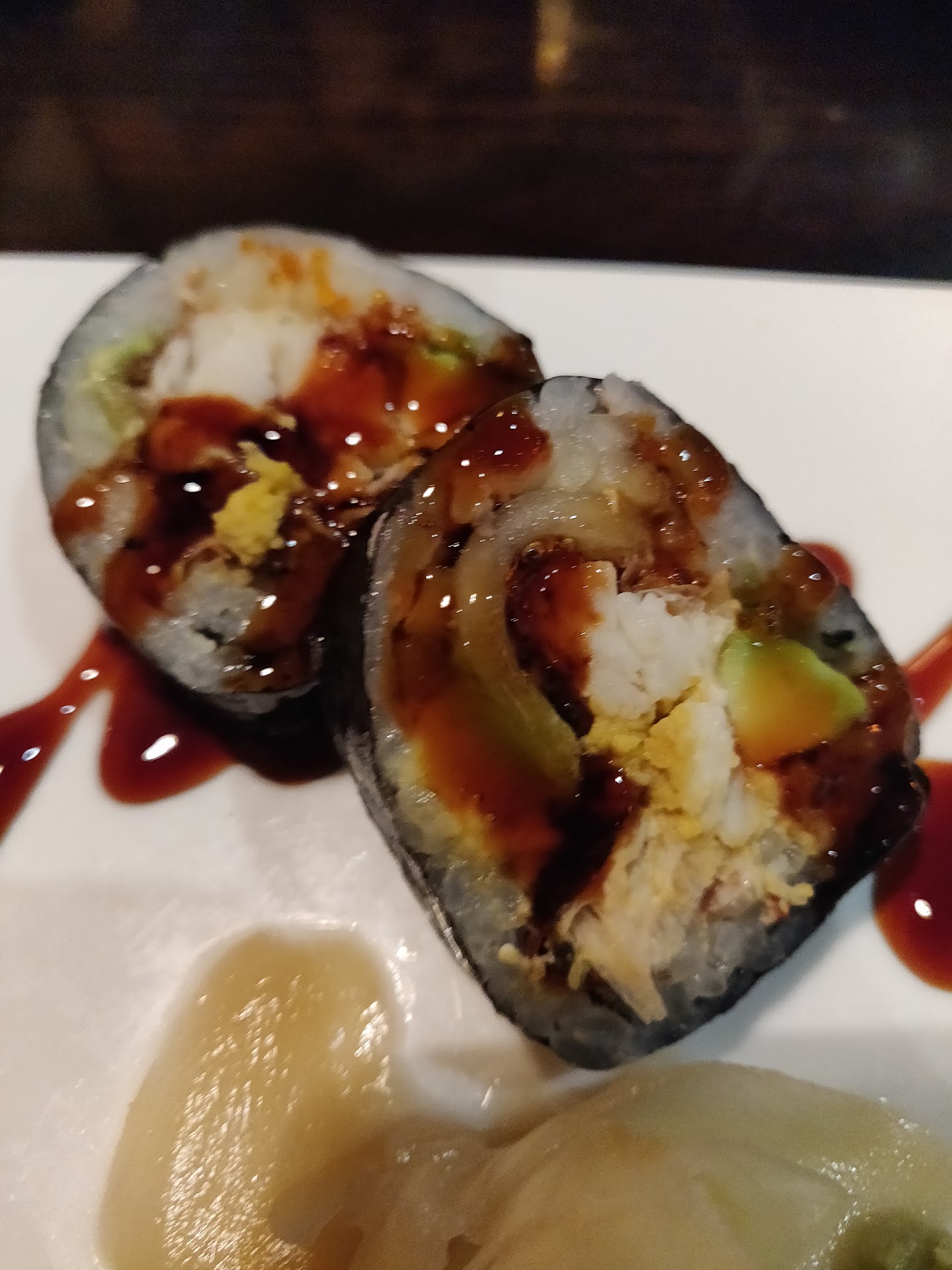 Spider Roll- (Fried soft-shell crab, avocado, cucumber and flying fish roe (fish eggs on inside), topped with eel sauce.)