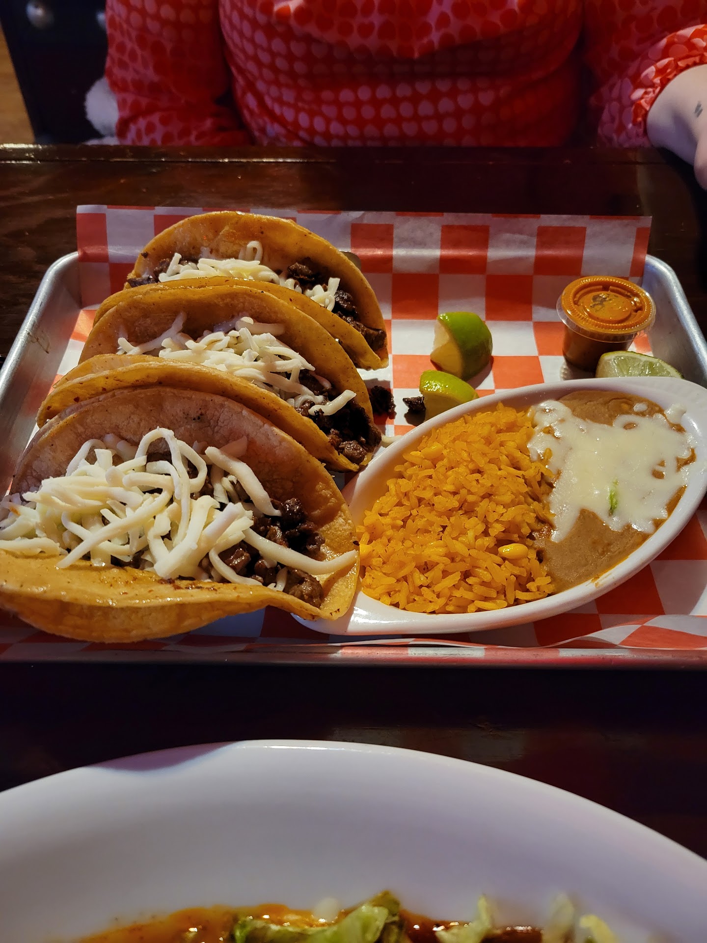 Decent food. Poor service. My girlfriend and I visited on Valentines Day night. We had booked a reservation online but it was not listed in their book when we arrived. It wasn't very busy at all so we were able to get a table right away, after the hostess/server cleared the table. We weren't offered chips & salsa until after ordering but we just chalked it up to having just cleared the table. We weren't ever offered water. Also not a huge deal, just seemed like basic things every restaurant or Mexican restaurant does. We ordered a couple cocktails. They took a while to make as this was another task for the same person, now a hostess/server/mixologist. The Pina colada didn't seem to have any alcohol in it. The purple dragon seemed to be ok though. We gave our food order and I specifically asked if all of the burrito Mexican had beans in it or was that just a choice like chicken & beef were. She said beans come in both with the chicken & beef. I ordered 1 chicken & 1 beef and said I do want beans also in both. She nodded and assured me that would happen. It did not. Neither burrito had beans. The red sauce was good & had a bit of spiciness. The chicken one was ok and the beef one was pretty bland. My gf had tacos vaqueros (steak). She didn't like them so I had 2 of the 3 next day warmed up for lunch. I thought they were just ok. The hot sauce was nice. Pretty spicy. Can't really judge the freshness a day later though. We ordered the chimi cheesecake dessert (which was pretty tasty) from a different server who came to check on us. It took a long time and the original server had come back and asked if we wanted the check. We said sure. She took 10 minutes to bring the check. Server #2 finally brought the dessert and apologized for the delay, gave a discount, and took our card for the check. He got distracted by a large group of ladies and took their pictures for them and finally brought the credit card back. It was our first time there and with so many other options we would probably not try the place again. Also, the Mexican music was nice for atmosphere, however it kept cutting in & out for a few songs. The decor was sparse compared to other Mexican restaurants I've been to. There were 4 or 5 tv's playing a college basketball game and at least 3 were delayed a couple seconds from each other so it was kind of distracting & off-putting for me. Might not bother others though, so I definitely didn't factor that...