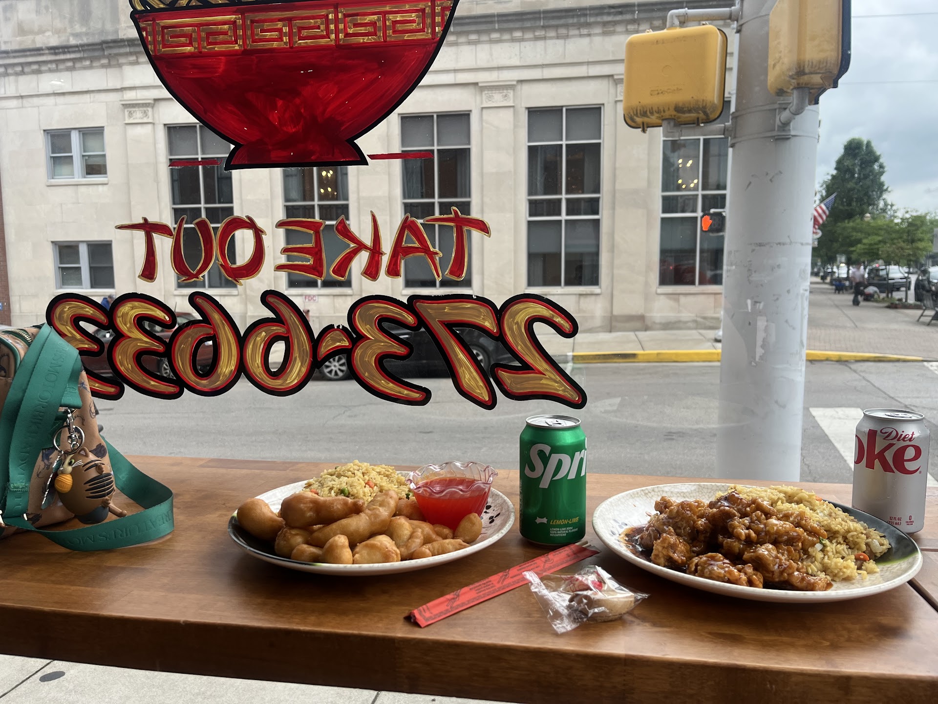 Dishes ordered: Crab rangoon(6 pieces) Sweet and sour chicken with white rice Triple delight with no mushrooms, make it spicy with fried rice. 2x bottled soda