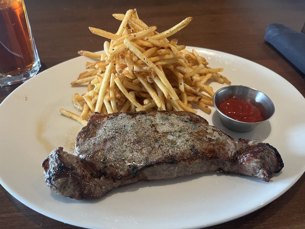 One big complaint for me is that there's no lunch menu here; all full-dinner prices all the time. Still, I was determined to get the complete experience because I didn't know if I'd come back or not, so I ordered the steak and fries with a sweet tea to drink. I enjoyed my tea except for my inability to get a timely refill. My food arrived quickly and was clearly cooked fresh. The steak was slightly closer to a medium-well than the medium I ordered, which I honestly thought was pretty funny given their dogged insistence that they won't cook well-done steaks. The fries were crispy and plentiful. The steak was tender enough but not remarkably so; the most notable thing about it was that it was quite salty -- probably from the maitre d butter they used to finish it. Again -- it was not intolerably salty -- but paired with the fries, it only further increased my need for more tea.