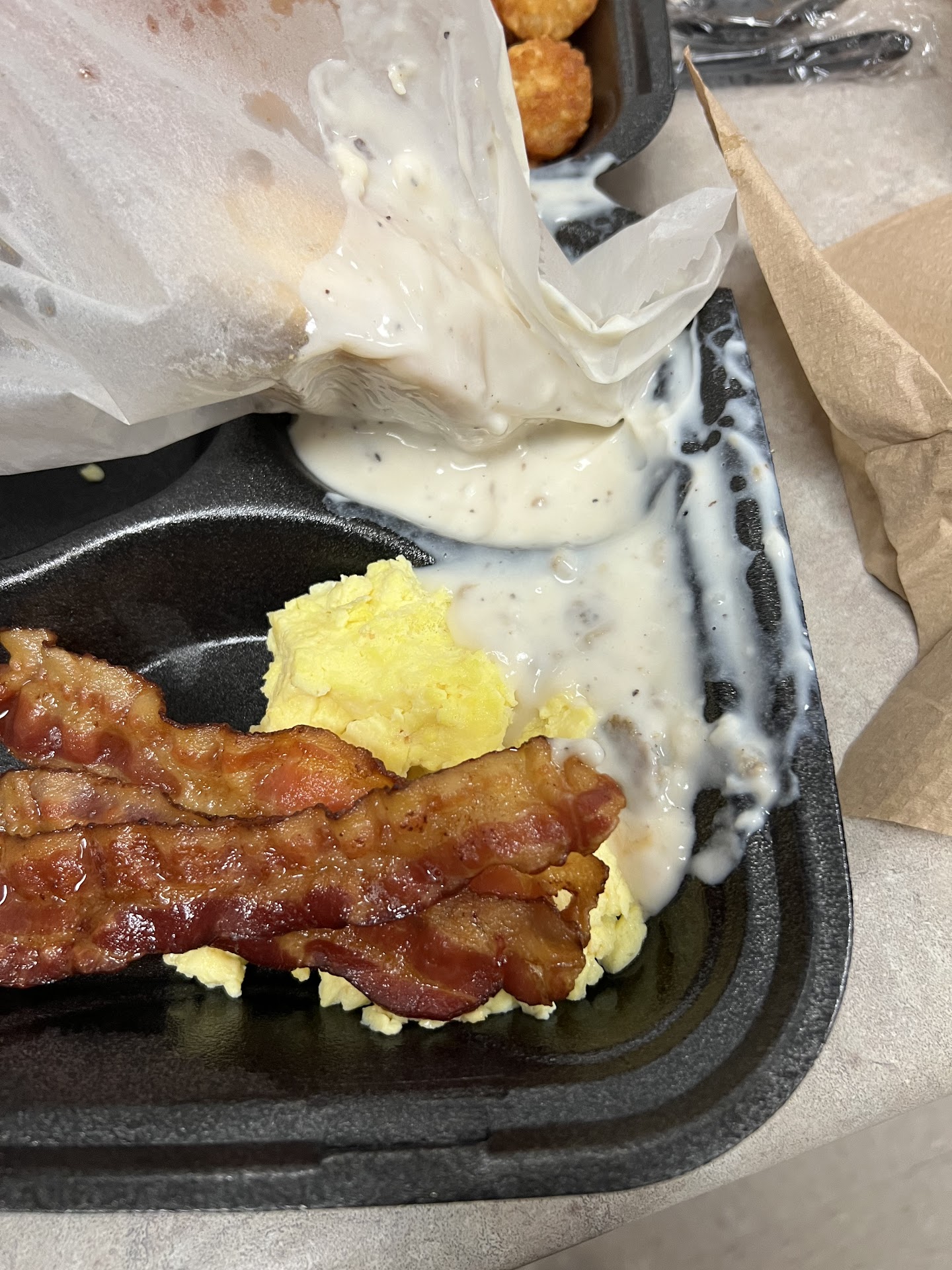Had a few extra minutes to spare this morning. Thought about going Burger King, didn't have enough time to go to Bojangles and I've never had a problem at Jack's till this morning. Drive through line moved quickly. Got my food and brought it home so my wife and I could have breakfast together before we left for work. She had a sausage gravy biscuit, lots of gravy one biscuit broken up and half a sausage patty broken into four pieces. I didn't do too well in geometry but I could tell that was not a full sausage patty. I had a chicken biscuit. Pretty much the same thing I get everywhere. Jack is always done me right chicken biscuits until this morning, the biscuit was decent tasting like it might have been sitting for an hour but it was definitely made that morning, can't say the same for the chicken not crispy at all kind of gooey actually. You can tell it was left over from the day before if not longer. I think I'll take the extra time for a little while and drive to the place down the road, where the spicy chicken biscuits with ranch...
