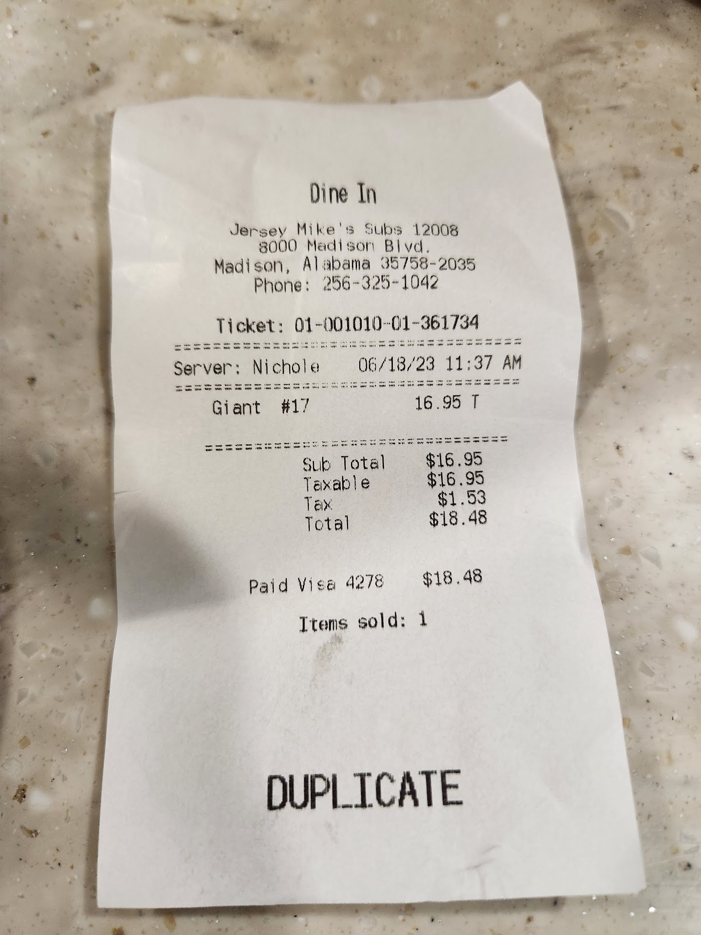 I'm not giving one star because the actual sandwich was the only thing I liked about this place. AC was obviously broken when we walked in...super humid and everyone was sweating. I went to the restroom to wash my hands and the soap dispenser was empty...and then the paper towel dispenser was broken too. Really tried to brush that all off so we wait in line for about ten minutes while 4 employees worked at everyone's lunch order (NBD). I finally ordered my food, and asked about the AC. One of the employees said it's been horrible and like this for a few days now. I couldn't imagine working behind that oven... She was trying to be positive and said "hey, it's only 81!" Lol poor girl Anyways, we went to sit down and eat and I realized the fourth person in our group was still waiting because she ordered a hot sub. Well....TWENTY minutes later after us three are finished eating, she finally gets hers. The employees are kind, but that was definitely not worth the outrageous wait. Apparently someone else heard the employees say that they have to take care of online orders...