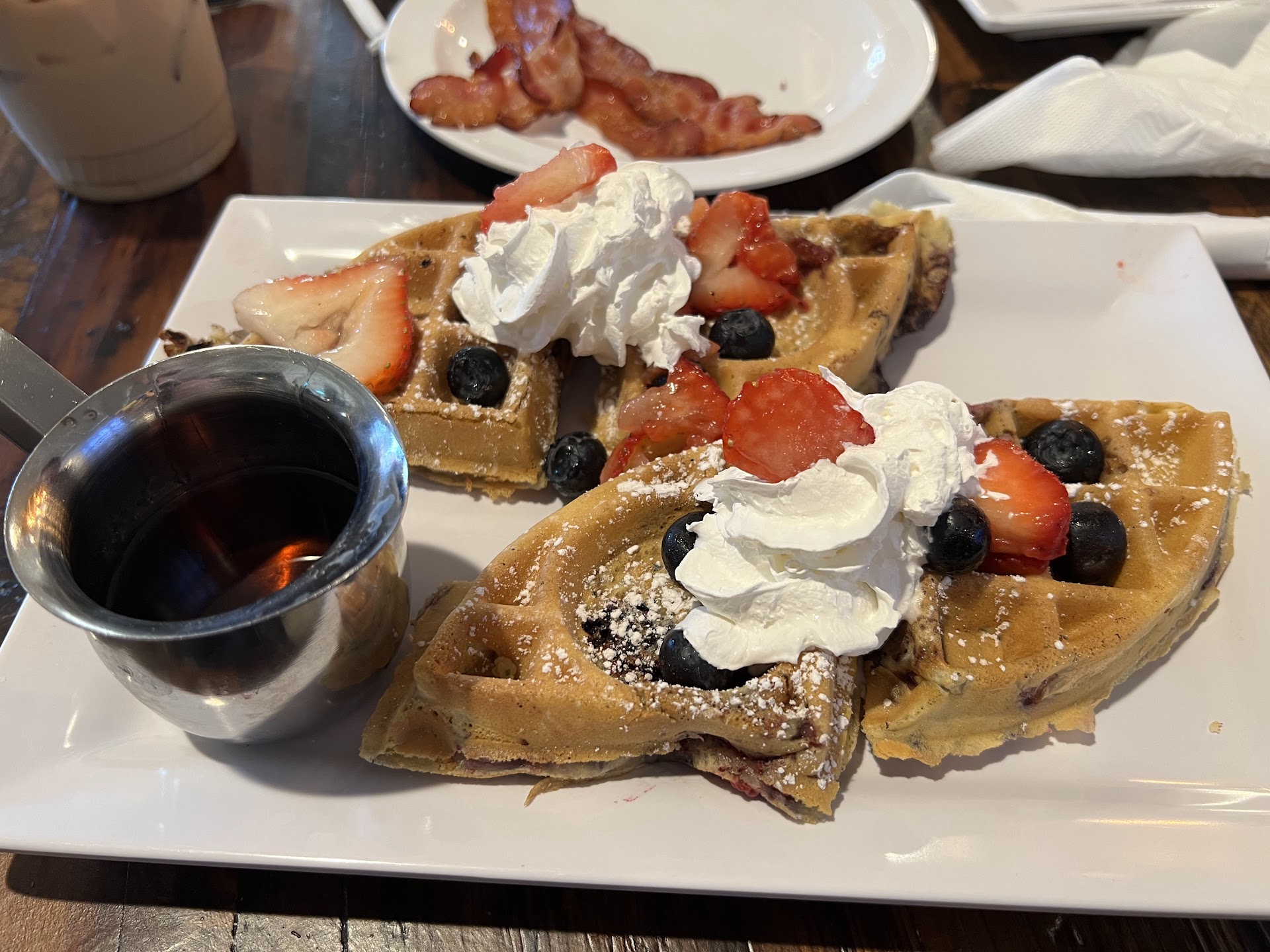 Definitely try one of the artisan waffles or womlette (omelette made in a waffle iron). The Berry Berry Bo Berry Waffle was really good. It had fresh fruit like blackberries, strawberries, raspberries, blueberries on top of it as well as inside. The womlette had Eggs, sausage, cheddar cheese, onions, peppers, tomatoes, and tots. The coffee I ordered was outstanding and arguably better than Starbucks.