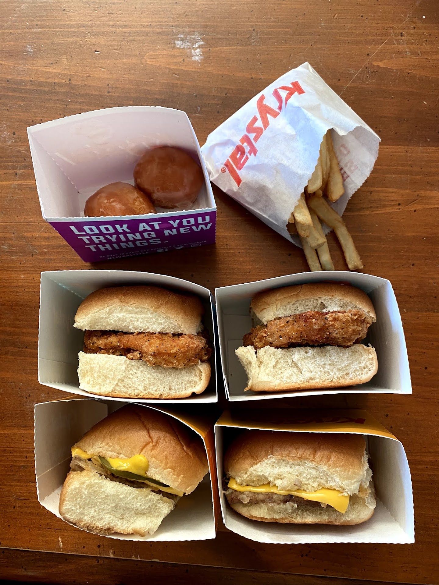 I had never heard of Krystal until tonight. I was looking for food after getting into town late, and it seemed like a good choice. I should have just gone to Wendyâs.