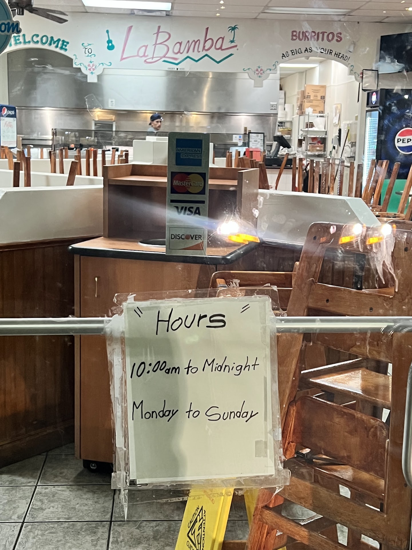 Still the best mexican-style tacos in town. Limes go well with them. Also, their Horchata is GOOD, not overly rich like at some other places. It's a bit pricier than I remember, but what isn't? Worth it. Decent place, it's a taco/burrito joint. If you expect a host(ess) or can't accept a straw wrapper left in a seat two minutes ago hasn't been whisked away yet, adjust your expectations. Menu is on the wall, includes La Bamba merch (for the hard to shop for), any specials on a board by the counter. Watch your order get made or TV. Drinks range from fountain (Pepsi🙂), Limonada and Horchata, to the cooler with water, Pepsico products, kids drinks, and some Mexican drinks like Jarritos (I like guava). Service is typically friendly and quick, expect a few minutes wait as they make it. Their late hours, like all La Bambas I've seen, are great; moreso in this age of slashed operating hours. Anywho, ordered four tacos al pastor, chorizo, and chicken (they were out of ground beef) with onions and cilantro: as nature intended. Always comes with a generous helping of sauce, which I'm amazed none of the little sauce cups have broke open in transit yet, yay! Sometimes limes are included, sometimes I ask, no big. They apparently deliver via a service, but I haven't used it. I miss the other old locations, hope another eventually opens; after all, who doesn't love tacos (and burritos, etc)? Healthy? No. Delicious? Yep!