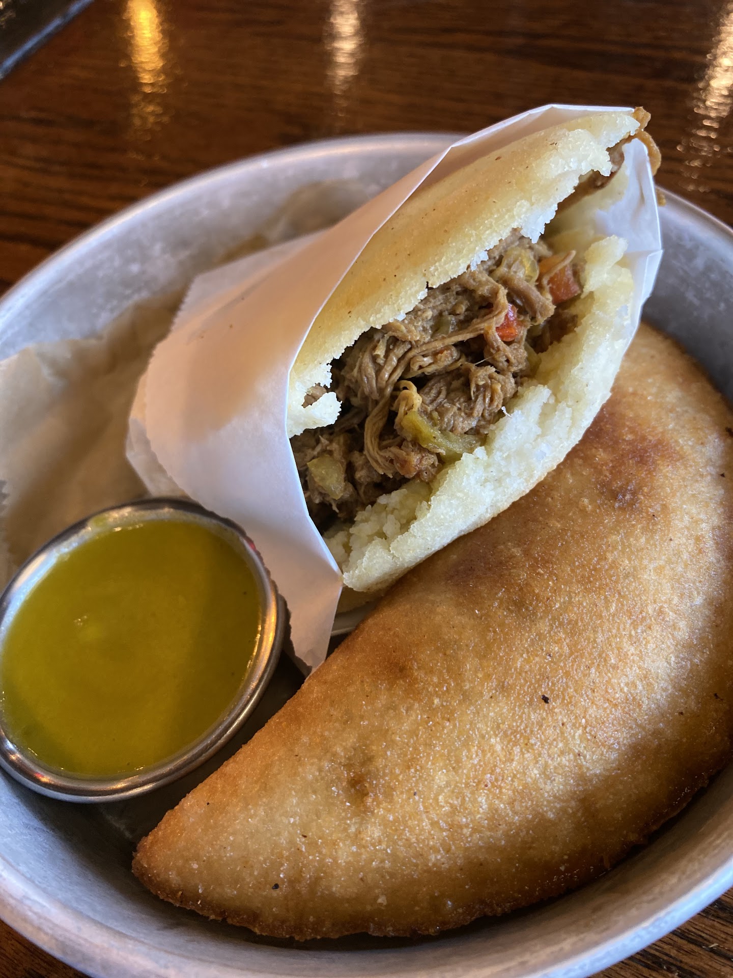 My dining companion, who grew up in Bolivia, was equally impressed with his order of Pabellon (black beans, white cheese, shredded beef, rice and deep fried sweet plantain and an arepa).
