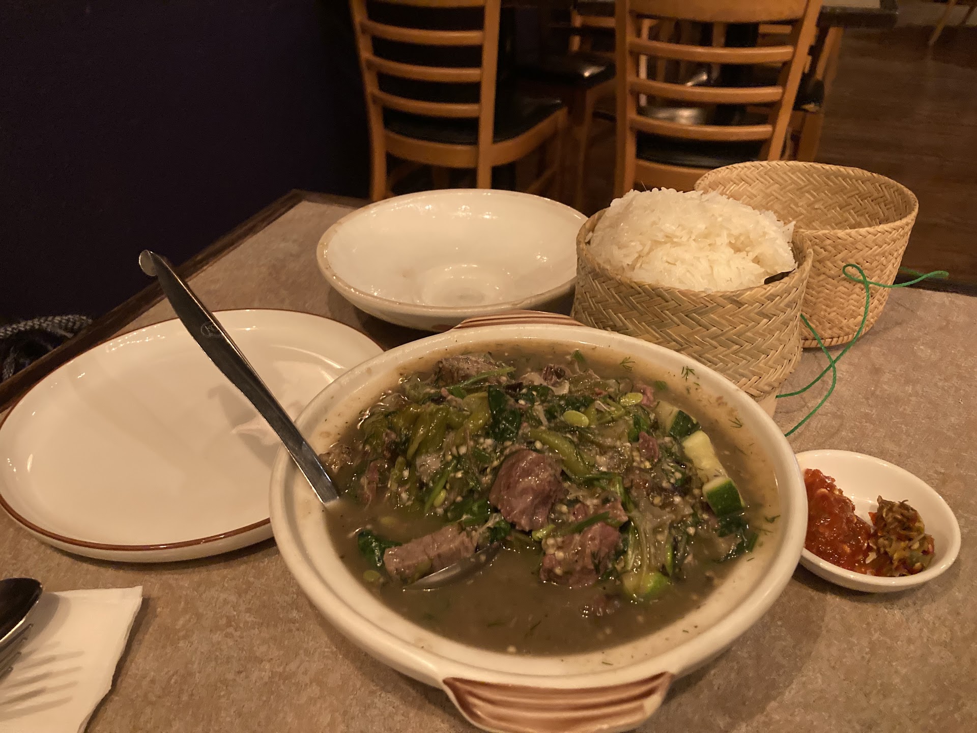 I like that they have an easy way to address how spicy you want things: timid, careful, adventurous and native lao. I went with the "careful" level of spiciness. The level of heat did not overwhelm the complex flavors for me, but next time I'll go for "timid" since it did start to get intense toward the end.