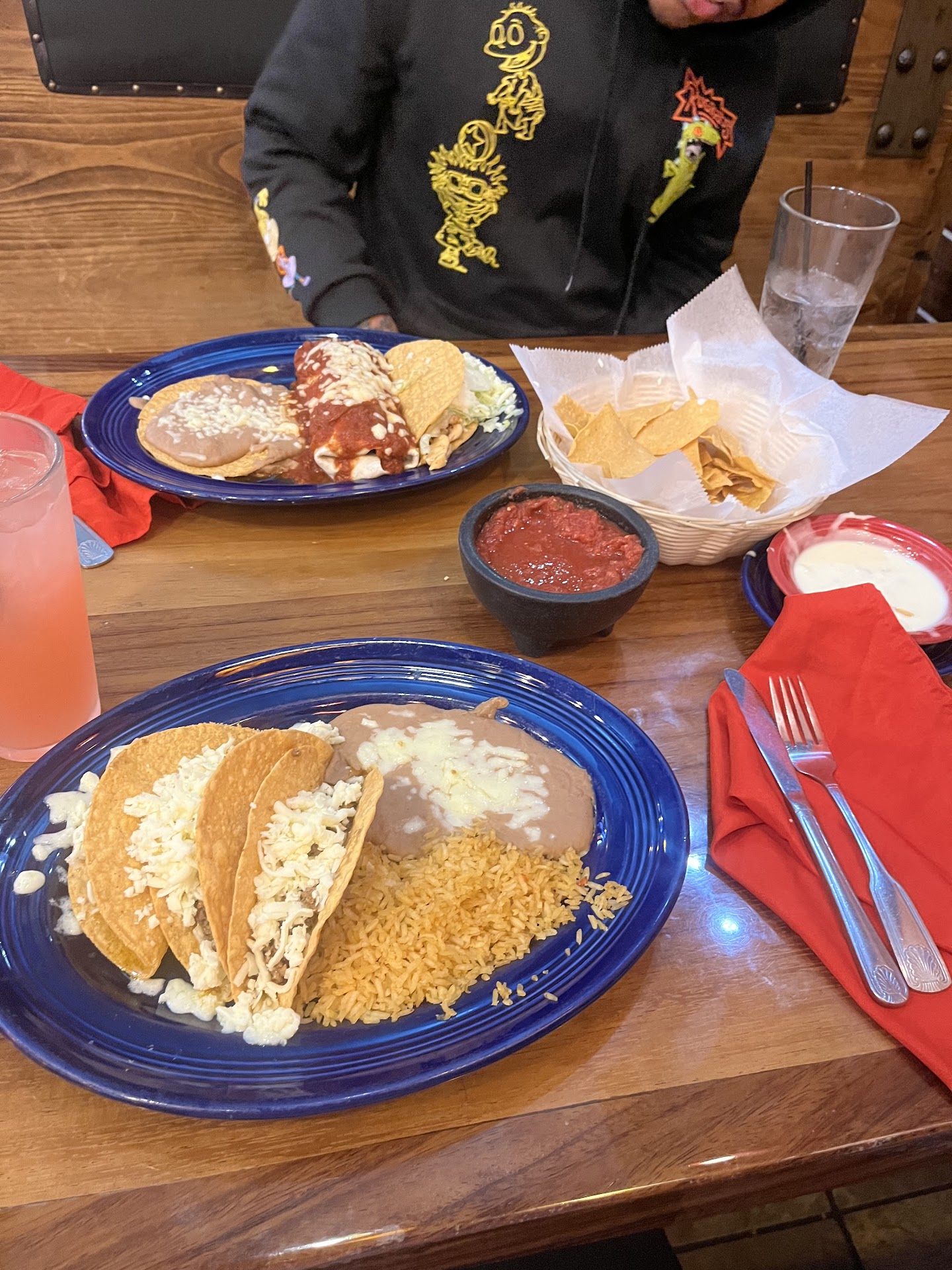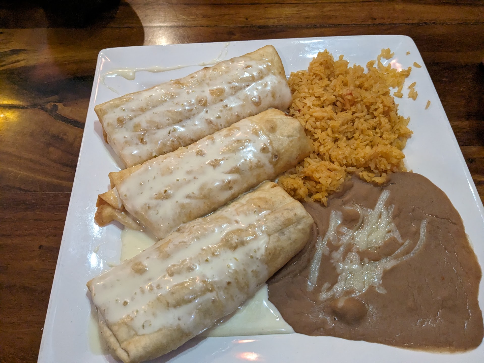 Read moreWas definitely hungry, and cruising down 72 to maybe find a new spot. Decided on Las Trojas, but should've let the mostly empty parking lot be a big clue. It happens at some of the decent places in town, so my family and I slid on in. Nothing on the menu sounded appetizing, and their specials were weird. I settled on the Burrito Real, the wife got the chicken chimichanga, and my son got a taco salad. We had the complimentary chips, salsa and ordered queso blanco. Hard to mess these up, right? Welp... If the chips weren't out of a bag and slapped in a warmer I'd be surprised. The salsa was also bland and had the stench of pre-bought on it (maybe with added cilantro?). The queso was queso, but no kick whatsoever. The chicken on the chimichanga looked like pulled chicken out of a bag or can, and had the consistency of it. The refried beans were not refried, or really even fried for that matter. They were runny and tasteless. The ground beef they used was below the grade used at Taco Bell, but at least it seemed within its expiration. I don't know what seasoning they used on it, but it tasted like adobo, which works way better with poultry. No cumin, chili, cayenne, but definitely salty. The lettuce and full slice of tomato on the side looked fresh, so there's that. The wait staff was good and nice, and the food turn around was super quick (almost disturbingly so).