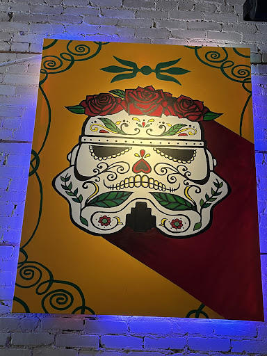 You get to âpick your vibeâ if you sit in a booth by picking which piece of art you sit under. We picked the âDay of the Deadâ skeleton with red roses!