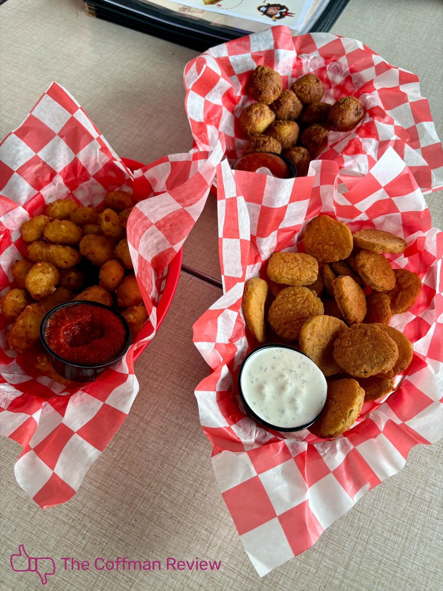 🧀 Cheese Curds 🤫 Hushpuppies 🥒 Fried Pickles 🐖 🥔 Tenderloin and Tots 🥓🥔 BLT and Chips 🐓 Boneless Wings in Thai Sweet Chili 🥗 Small House Salad 🧀🧅 Grilled Cheese and Onion Rings 🍔🍟 Cheeseburger and Fries 🐓 Chicken Tender Basket