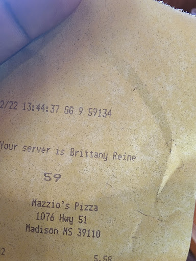Read more7/9/2025 My daughter, grandson and I came in Mazzio's in Madison, MS and the young lady at the cash register was very nice and accommodating. The young man who came out, whom I assumed was the cook and just stared at us. I spoke and asked him how he was doing since he was staring. We got our plates and cups to dine in. There was a pile of trash that had been swept up sitting in the floor. No booths or tables were wiped off. I am always prepared so we wiped the tables and seats with sanitizer wipes. The salad was decent and also the cheese sticks. When the sweet cashier brought our pizza out and we begin to eat, I kept thinking that something was missing. I finally looked real carefully and saw that THERE WAS NO SAUCE on the pizza. It was just meat and cheese. I asked the young lady to come and look and she readily said she could take it back and make a new one herself. We overhead the "cook" asking about the pizza and she told him that it had no sauce. He seem to not care about what had happen. The sweet young lady brought our correct pizza out. The next thing we hear is this awful conversation that was not suitable for anyone in a restaurant to be listening (cursing and vulgar language). I could not take it anymore and we got up to leave. I can say that I will never visit this restaurant again. I feel that this needs to be addressed as soon as possible or this particular location will loose...